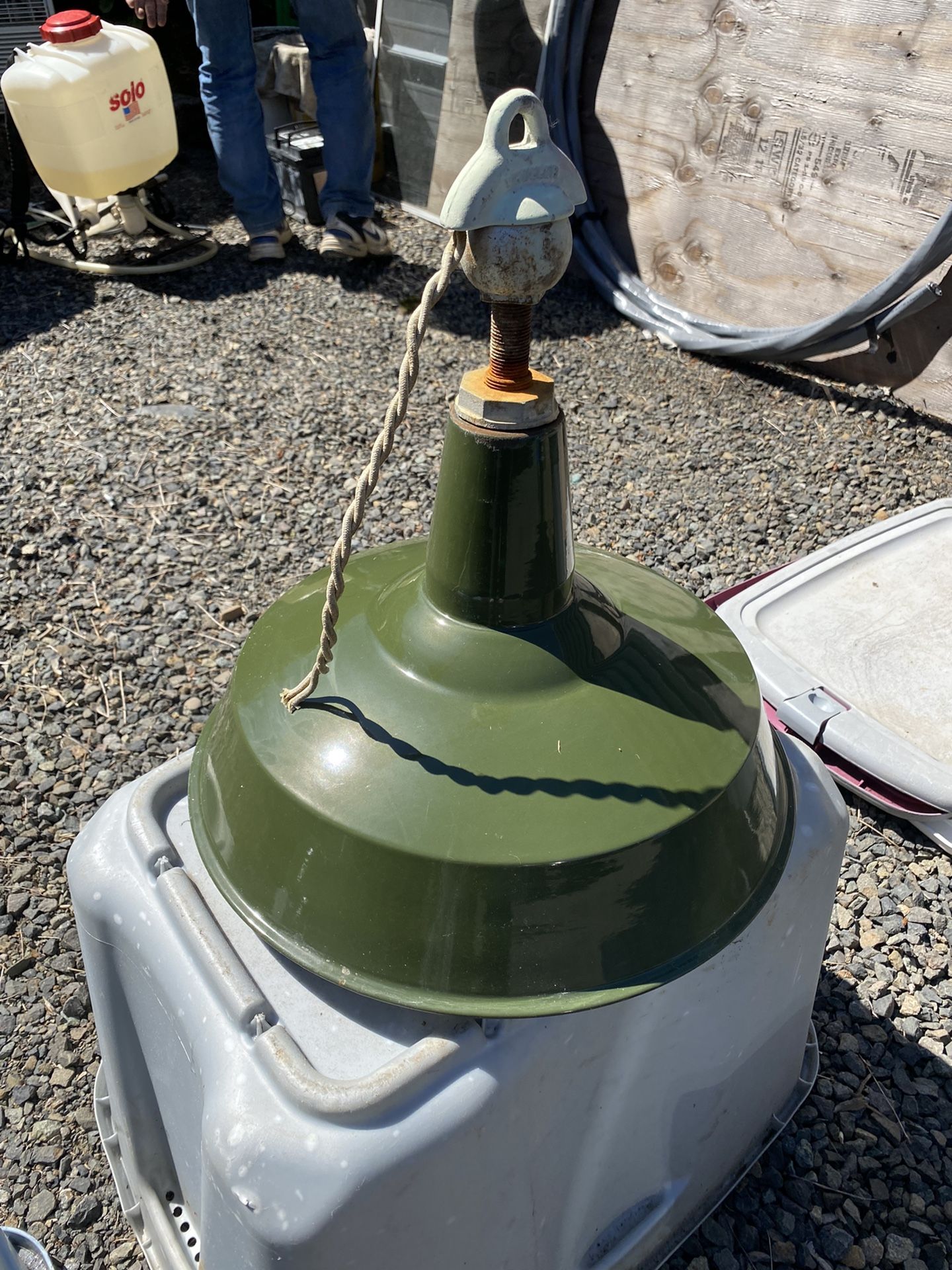 Army green vintage hanging light. Great for a man cave, workshop, garage or over a game table.