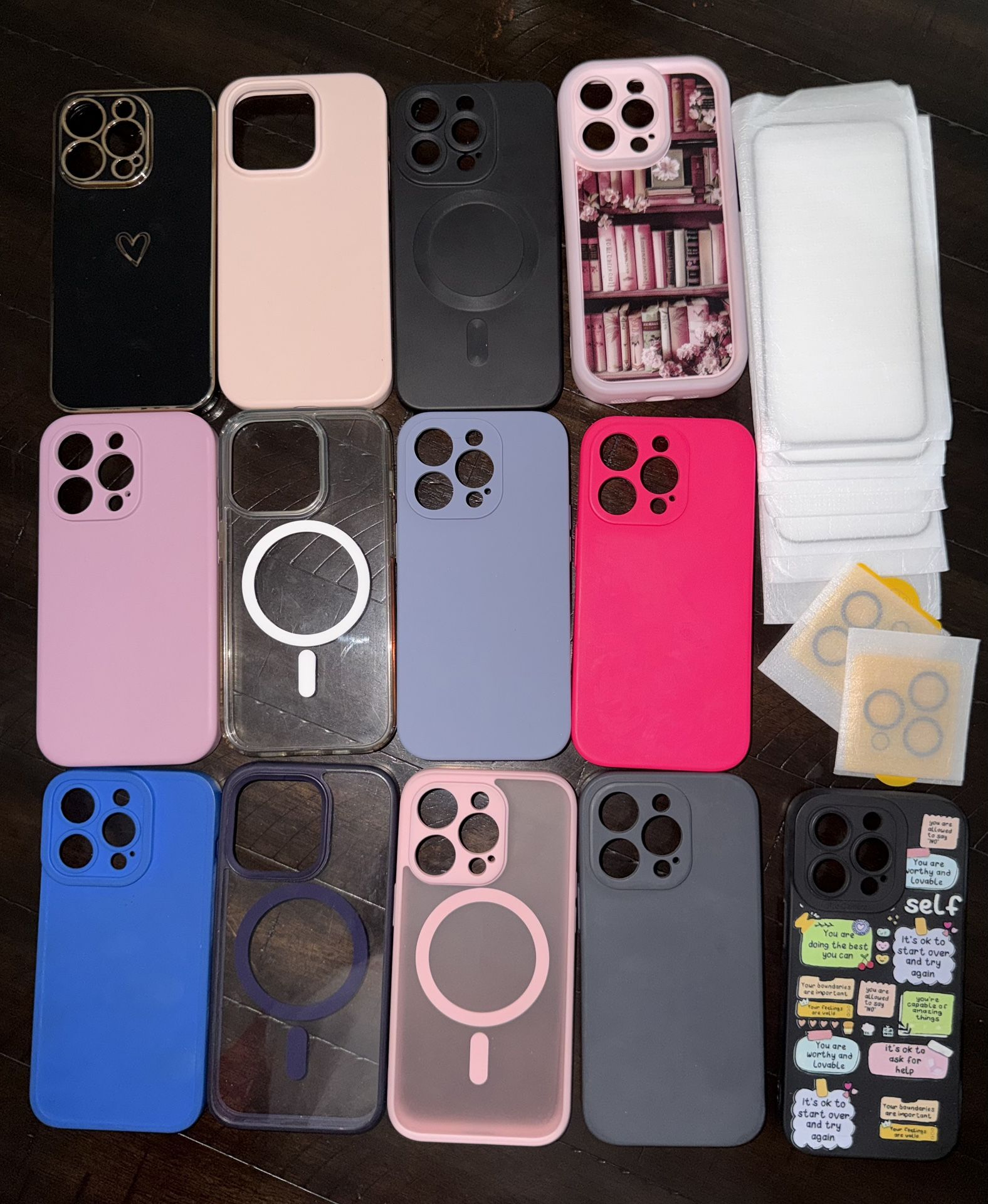 13 iPhone 14 Pro cases, with 8 new screen protectors, and 2 new camera lens covers. All sold together!! Cases are used, nothing broken (some may need to be cleaned due to coloring from jeans)