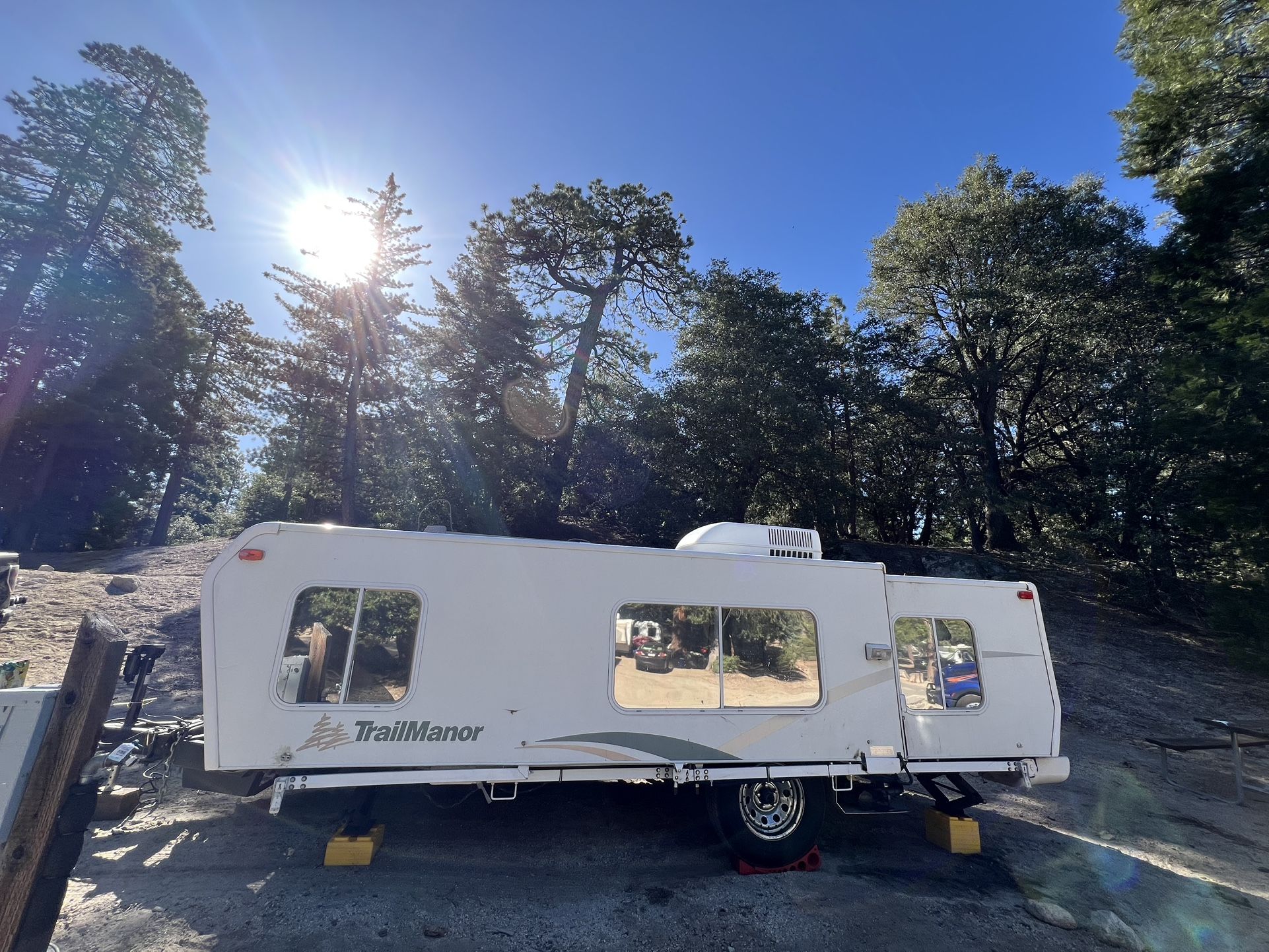 Trailmanor trailer, folds down to fit into garage. When opened up, it is hard sided. Not a regular pop up. We’ve been in Sedona in the summer and Utah in thanksgiving and been comfortable! Sadly, it is time for our family to move on, looking for another family who will enjoy it :)