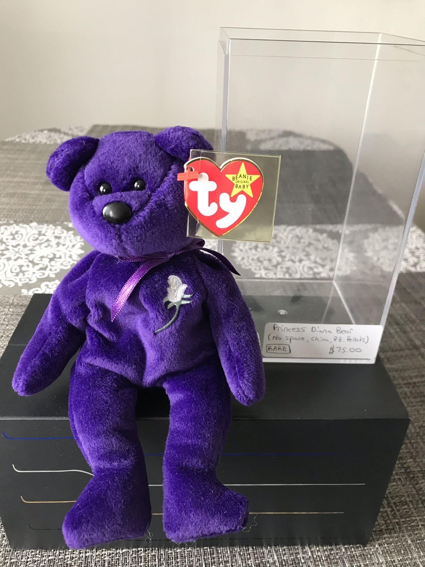 This beanie baby is Princess, the Princess Diana bear. It has a “no-space” swing tag and it’s tush tag states it was made in China with P.E. Pellets. The only “no-space” swing tags were attached to Princess bears that were part of the first production run of this beanie baby, which came from China. The “no space” term is referring to the fact that, on the swing tag, there is no space above the line “DIANA, PRINCESS OF WALES”. You can see this in the picture on the swing tag on the right side right above my finger. Swing tags that do have a space above this line are from later production runs and are less valuable.