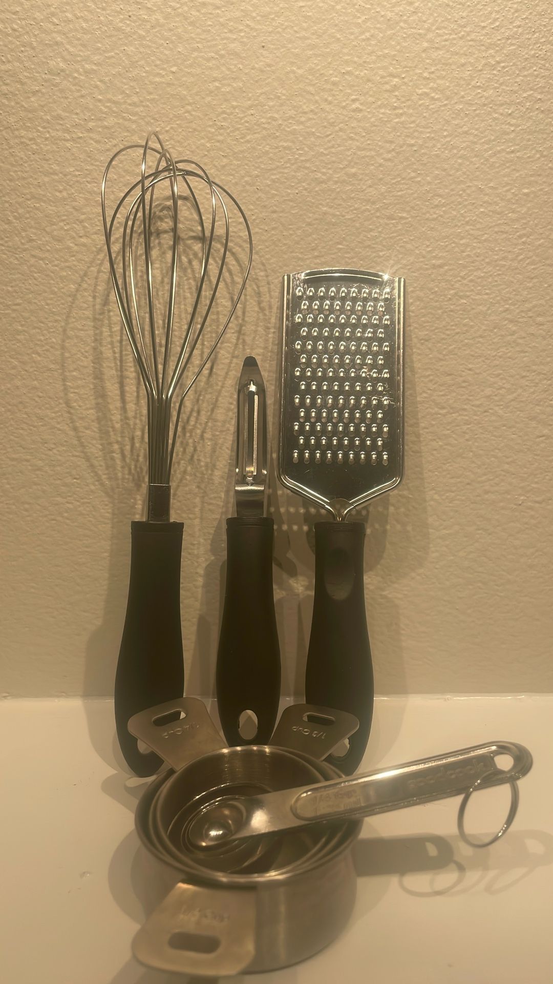 5 piece kitchen utensils-clean & excellent condition : stainless steel- whisk/peeler/grater/measuring cups & spoons Pickup/meetup/delivery