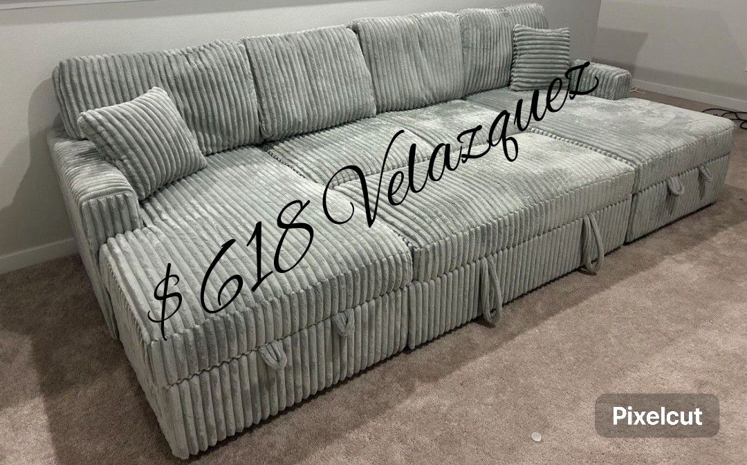 ✅️✅️3 pc Smoke grey corduroy fabric sectional sofa with double storage chaise and pop up sleep area in center. Sectional features a pull out sleep area in center and double storage chaise . Sectional measures 120" x 60" x 37" H.✅️$618 + sale tax $680 total cash only, this promotion is just pick up only Delivery is not available ✅️✅️