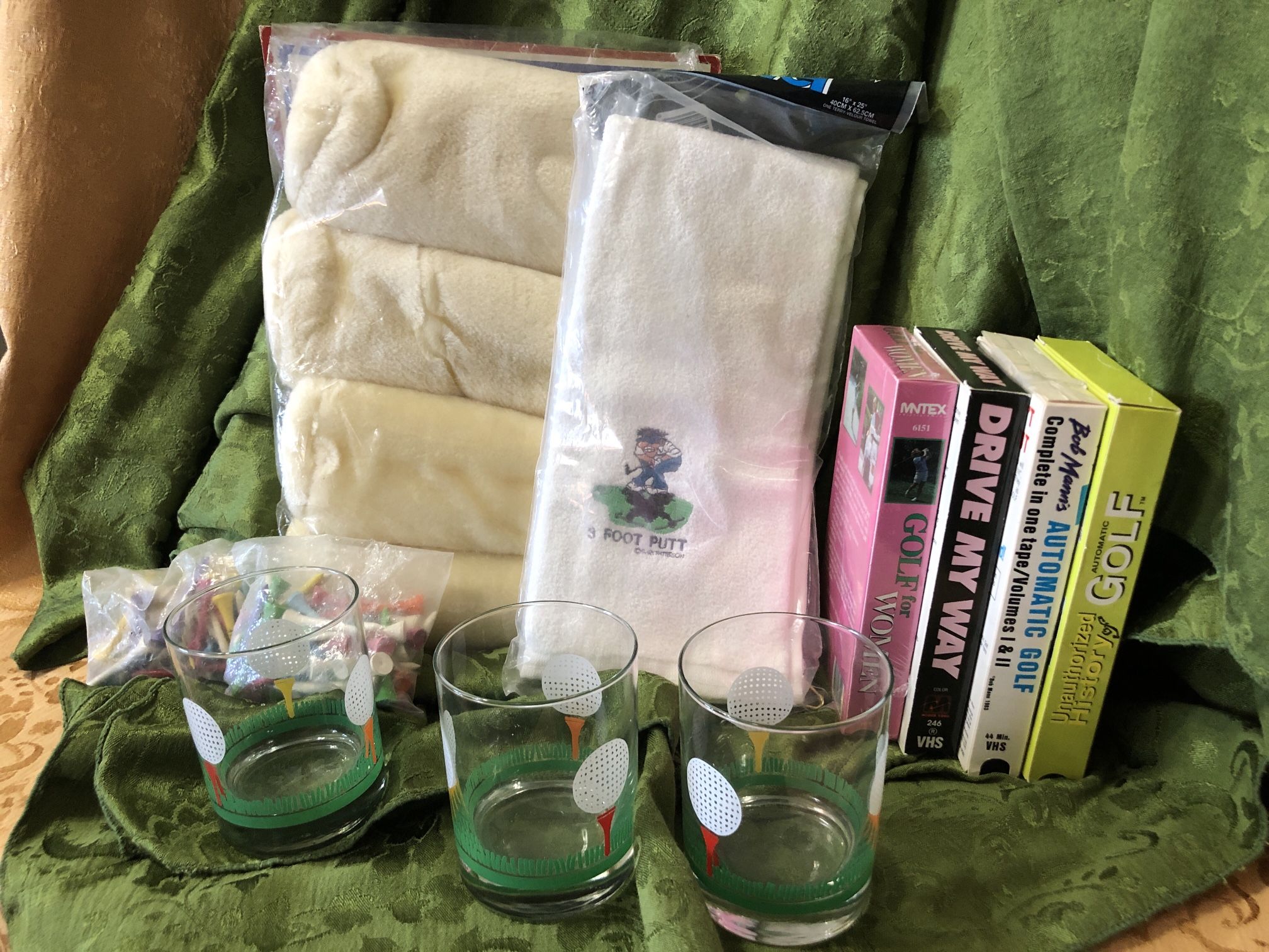 Surprise Mom or Dad this year with these Golfing Items! Faux Fur Club Covers $25, 3 Foot Putt Towel $10, 4 VHS Instructional Videos $4 each, 3 Vintage Retro Whiskey Glasses $9 each or $20 for set of 3, Golf Tees $5 Local PU only Can be purchased separately