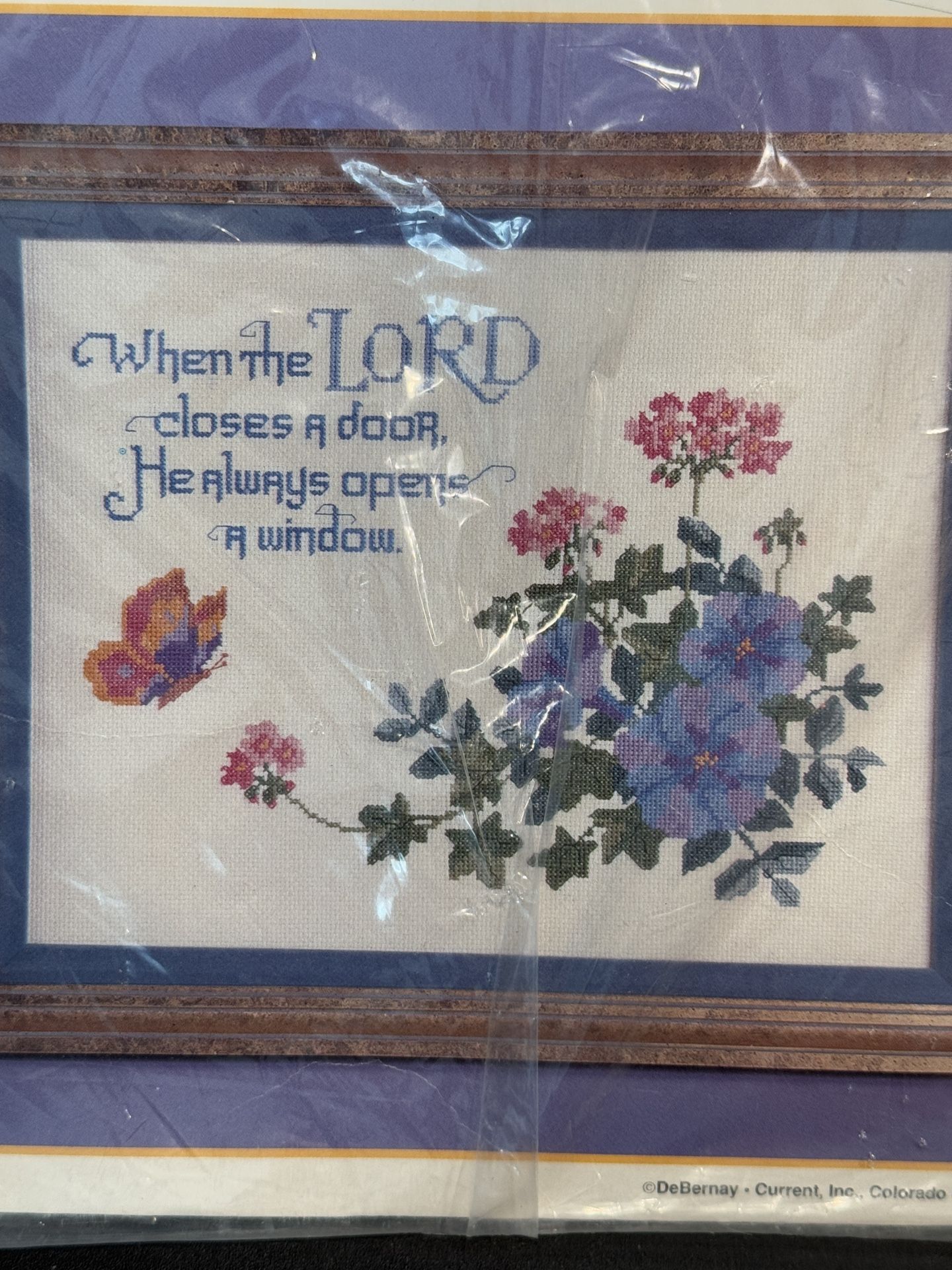 Current Windows of Faith Counted Cross Stitch Kit Butterfly & Flowers Christian. This kit is new in package. Finished size 11” x 14” Code 91152-5 This cross stitch kit has a single butterfly and flowers which I believe are morning glories. The quote says “When the Lord closes a door. He opens a window” This is new sealed, but it appears there is some rust spots on the needle.