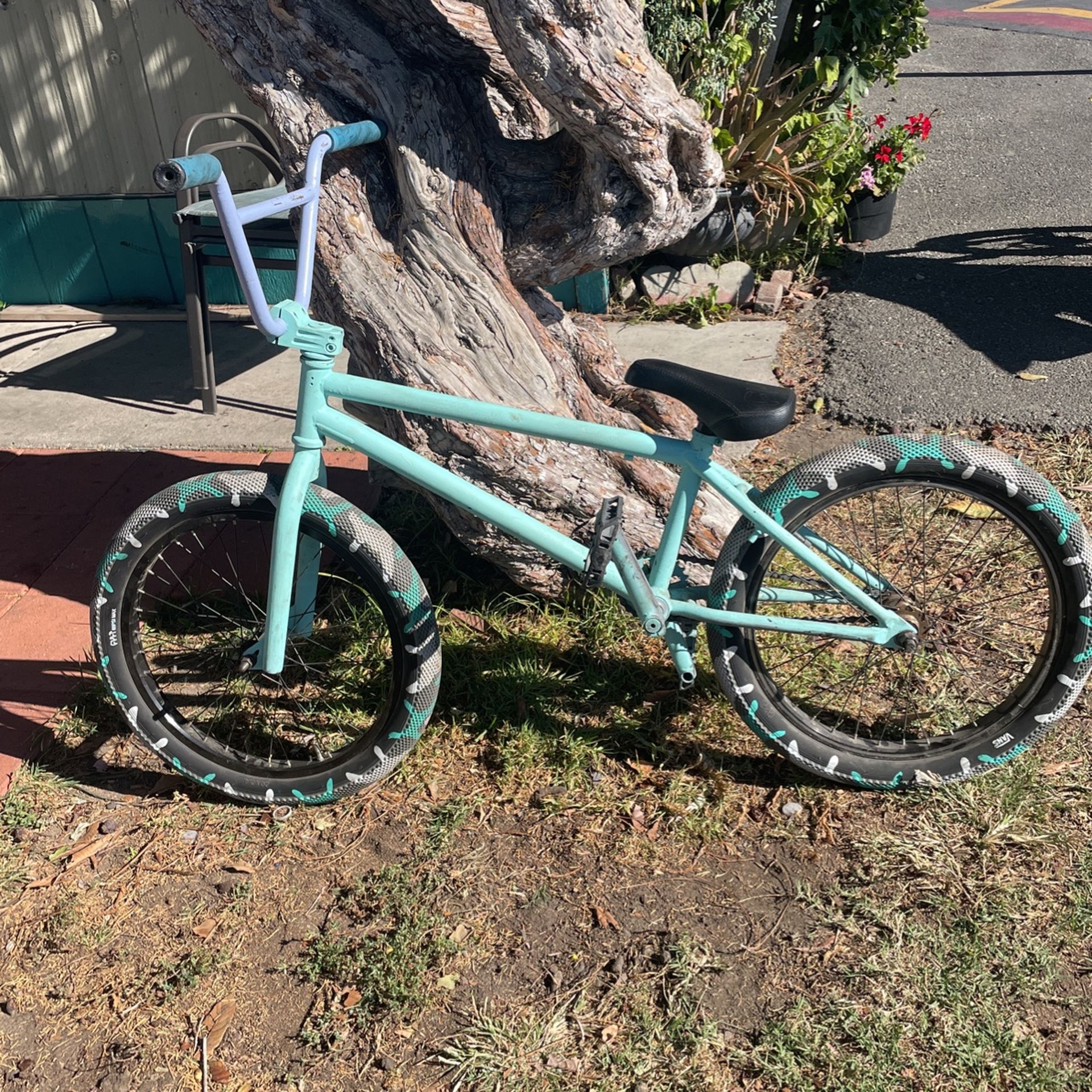 Tires and seat are cult Green white and grey Camo printed wheels Teal frame Lavender handles