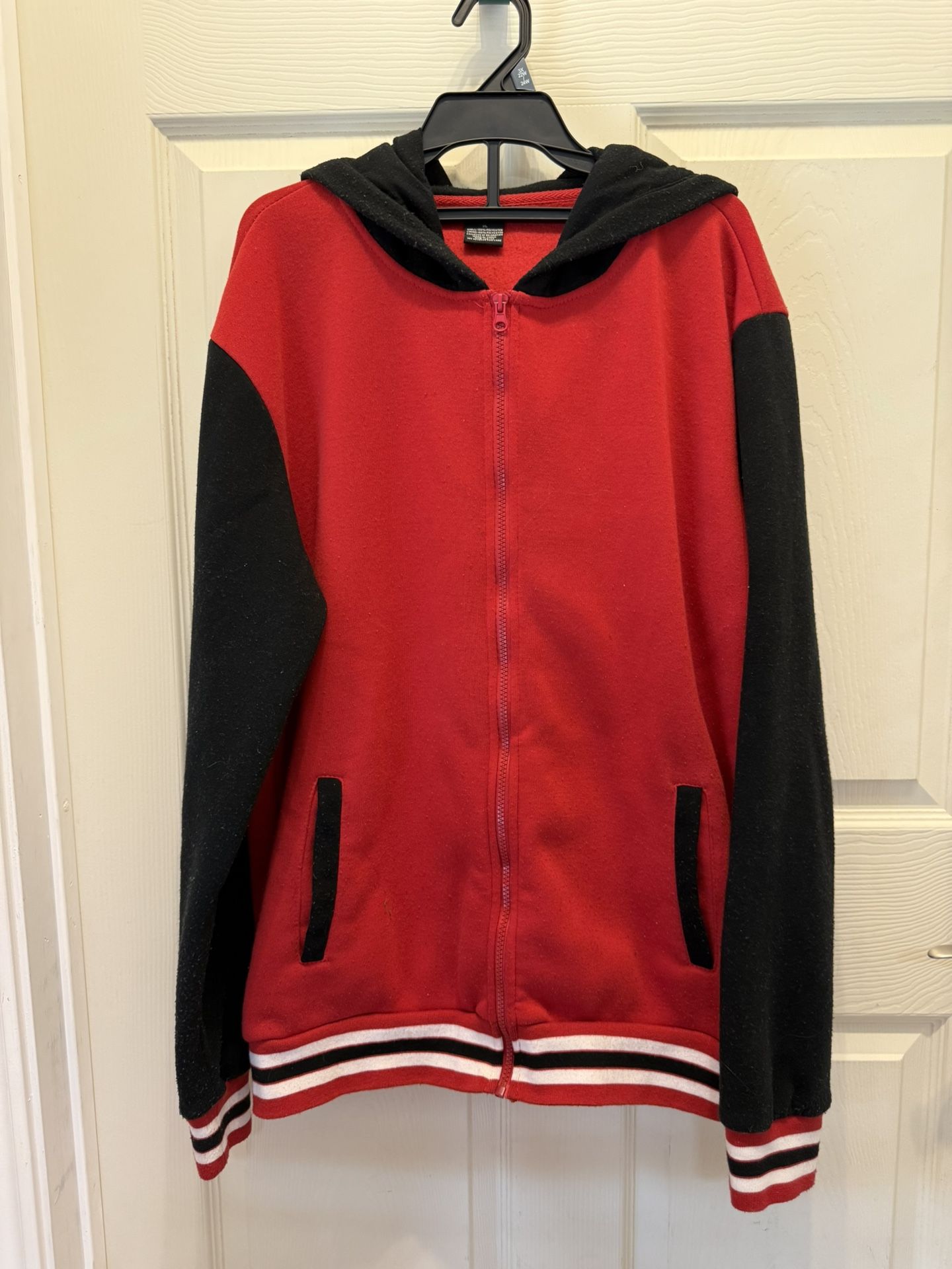 Stay warm and stylish with this men's red and black zip-up hoodie. Perfect for casual outings and everyday wear. Must pick up, cash app only.