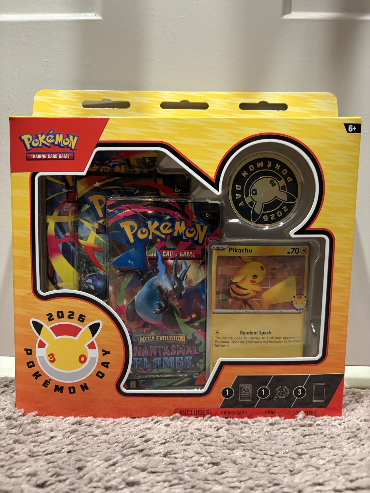 Will discount to $25, if you buy any other unsealed tin I have put together myself on my page at asking price. Otherwise this collection box is $30. New and sealed 2026 Pokemon Day Collection box. Asking $30, but will discount $5 as mentioned above. This Contains: - 1 Foil Promo w/Pikachu Pokémon Day Stamp - 3 Pokémon Booster Packs - 1 Pokémon Coin