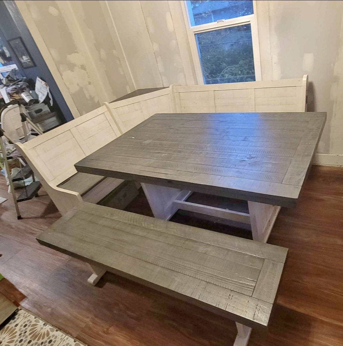 Corner Dining Nook that didn’t fit in my space as I hoped. Table and benches are in good condition with small paint splatters on table that I was planning on sanding and repainting! Dimensions: Table - 60” x 38” L Bench long side - 76” x 20” L Bench short side - 58” x 20” Straight Bench - 60” x 15” Pick up in West Seattle!