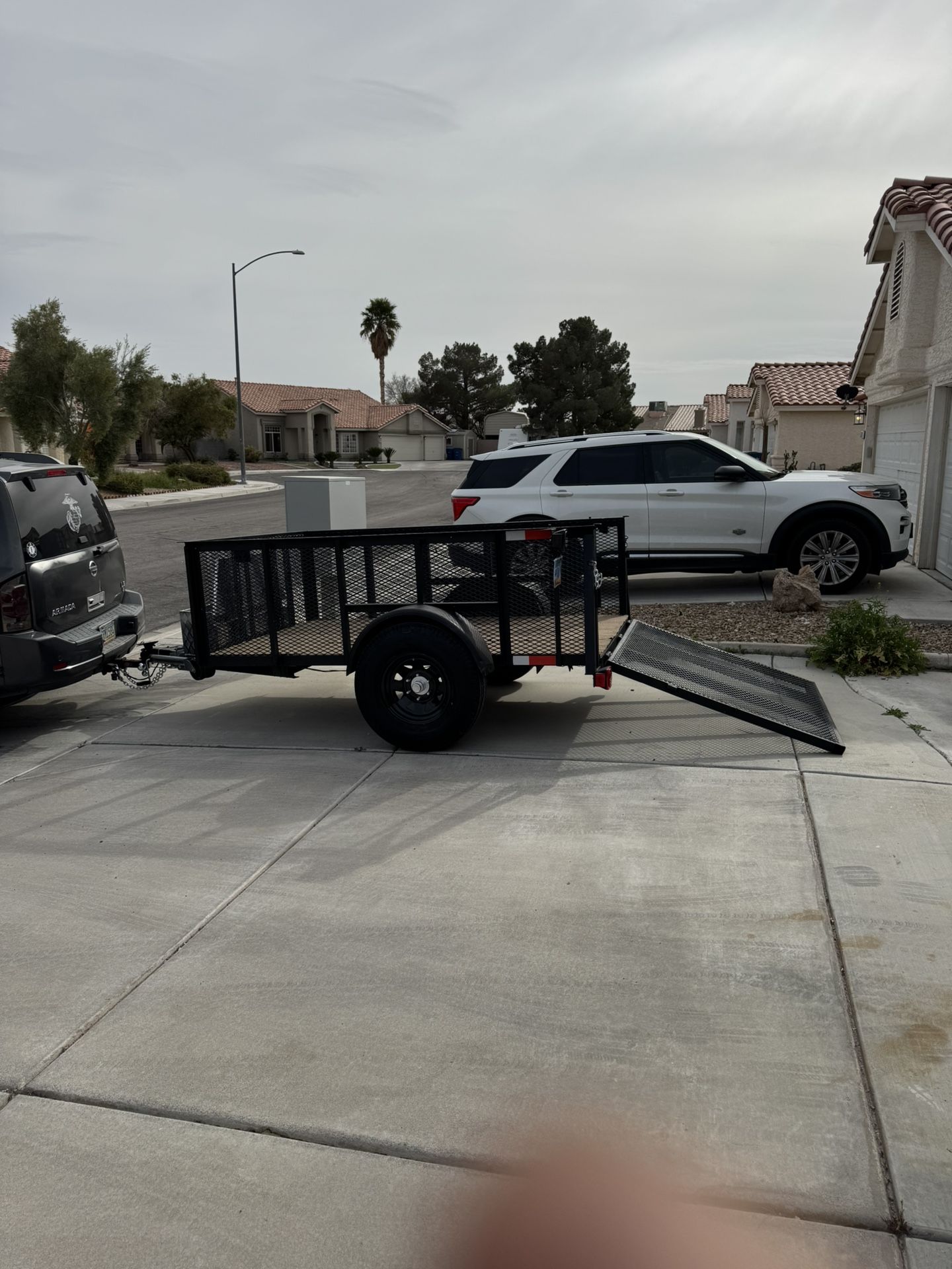 2011 Very nice 5 x 8 x 3 ft. steel heavy duty utility trailer with brand new 2 1/2 " thick triple floor solid, with new strapped down clips secured tightly into flooring. Indoor outdoor carpeted. New matte black paint. With chrome painted safety hook chains and gate lock chain bars. 4 ft. fold down steel caged ramp. Heavy duty tires with excellent deep tread almost like new. Gloss black rims with chrome axle caps and long chrome custom lug nuts.Brand new Chrome front locking secured utility and storage box with two lock https://offerup.com/redirect/?o=a2V5cy5OZXc= front silver double wheel cranking tongue jack. 2" ball tongue . Brand new just installed wire harness and plug with two LED tinted smoke color 'upper' running, brake, and turn signal lights with lighted license plate mount. Two brand new 'lower' LED red color running, brake, and turn signal lights. Four (4) new LED lights total. This is a great heavy duty utility trailer everything's pretty much new on it.A-lot of time and work has been put into this trailer.Ready to go to work for you. "Clear title in hand". No low ballers please.