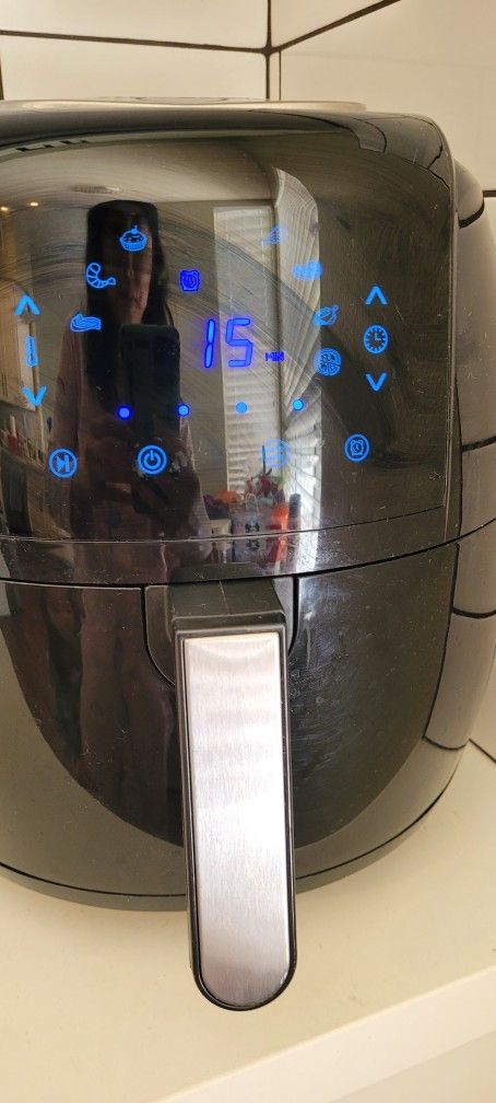 Used in good condition, still works great. I'm just upgrading to bigger one. Healthier cooking in 30 min or less: Thanks to rapid air technology, you can now experience your favorite food without the extra calories. This air fryer can fry, bake, grill and roast with little to no oil. Modern touch screen design: Sleek and modern look with advanced touch screen menu. New features include a start/stop button allowing you to change your program mid-cycle, as well as a built-in alarm function to remind you to shake your ingredients in 5, 10, and 15-minute increments. 8 preset cooking options and accessory: Enjoy 8 pre-programmed cooking functions including fries/chips, pork, chicken, steak, shrimp, cake, fish and pizza. Or, use the manual controls to customize to your needs. This air fryer is equipped with a wide temperature range from 180F to 400F and a timer for up to 30 minutes. Cook 2 meals at once with the basket divider accessory