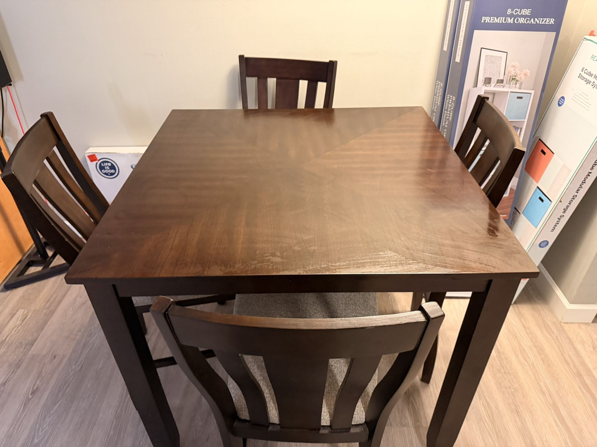 I'm selling a gently used table set that I purchased about 4 years ago. It has some minor cosmetic wear, but overall it's still in great shape and functional. The dimensions are L & W = 42” and H = 36.25”. To make it easier to move, I'll disassemble the table so it can fit through the door. Please note that you'll need to arrange transportation, as I won't be able to provide it.