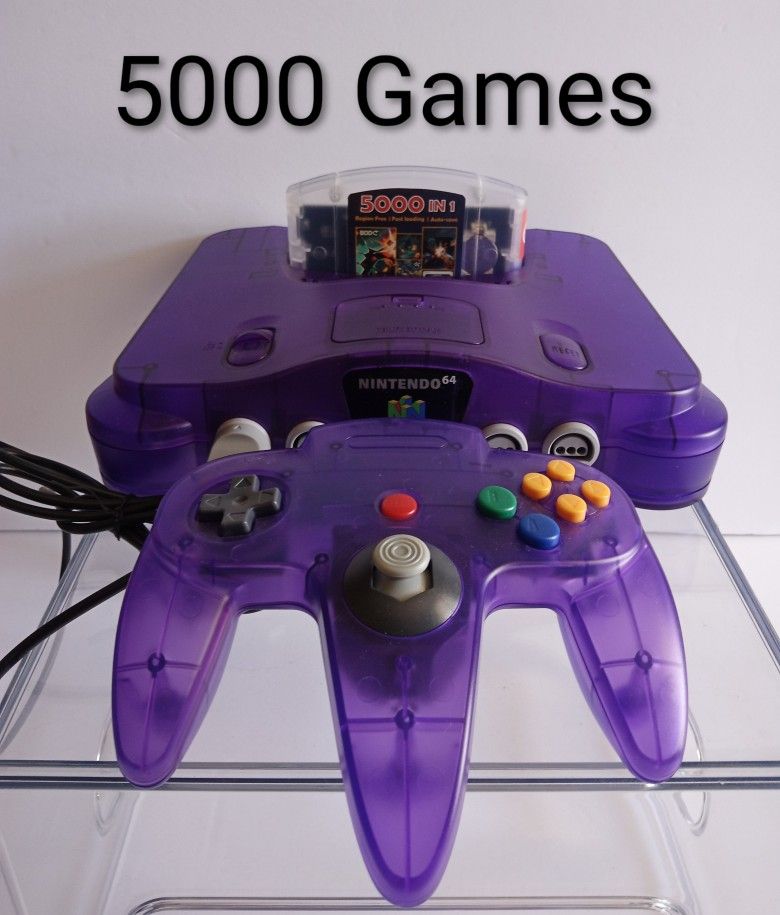 Custom built N64 with translucent purple shell, purple controller, summer cart 64 with 5000 Nintendo games including the complete N64 library. Comes with all cables to plug and play. Brand new power supply included. Custom Consoles AZ in Apache Junction Arizona has been building systems for over 11 years.