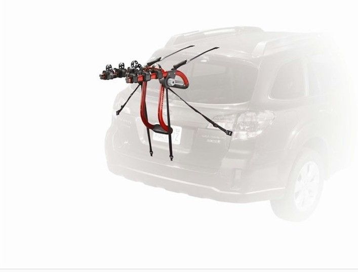 Used - Yakima SuperJoe Pro bike rack, designed to carry up to three bikes. It attaches to the trunk or hatch of most vehicles using a six-strap system and features padded feet to protect the car's finish. The rack includes StableCradles to hold bikes securely and a QuickTrigger Hub system for easy installation and removal.