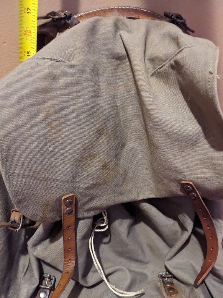 Very good condition M39? Swedish military rucksack backpack. I won't take an 'era' since I haven't found a date. The leather is in good condition and pliable except the one strap on the bottom. The leather strap on the bottom is torn almost all the way. Stitching or brass connectors can be found online.