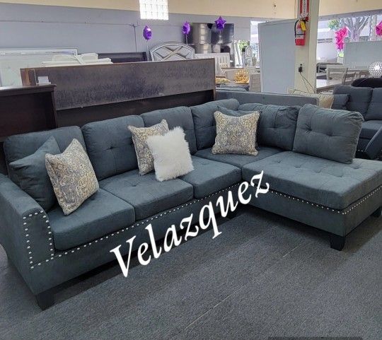 ✅️2 pc ash black tweed like velvet fabric sectional sofa with chaise and nail head trim. This set includes the 2 pc sofa with chaise sectional throw pillows. This sectional is in tweed like velvet fabric. Sectional measures 99" across the back, Chaise comes out 66" and each piece is 33" Deep and 35" H $272+ sale tax $300 cash 💸 💰 only delivery is not available ✅️