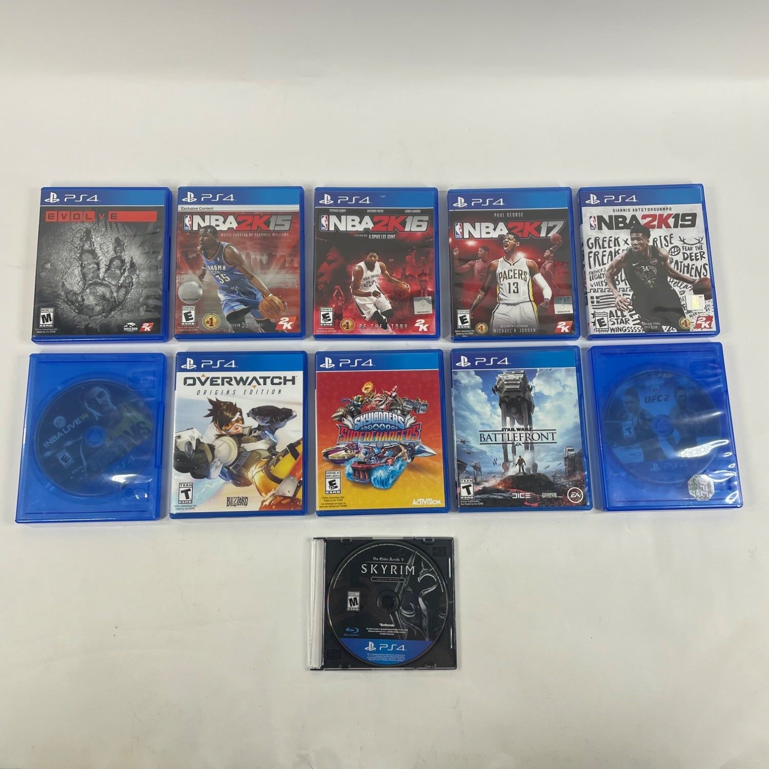 | Game Names | ●The Elder Scrolls V: Skyrim (Disc/Cartridge Only) ● Evolve (with box/case and manual) ●NBA 2K15 (with box/case, no manual) ● NBA 2K16 (with box/case and manual) ●NBA 2K17 (with box/case, no manual) ●NBA 2K19 (with manual, no box/case) ●NBA Live 17 (Disc/Cartridge Only) ●Overwatch (with box/case, no manual) ●Skylanders Superchargers (with box/case, no manual) ●Star Wars Battlefront (with box/case, no manual) ●UFC 2 (Disc/Cartridge Only) |