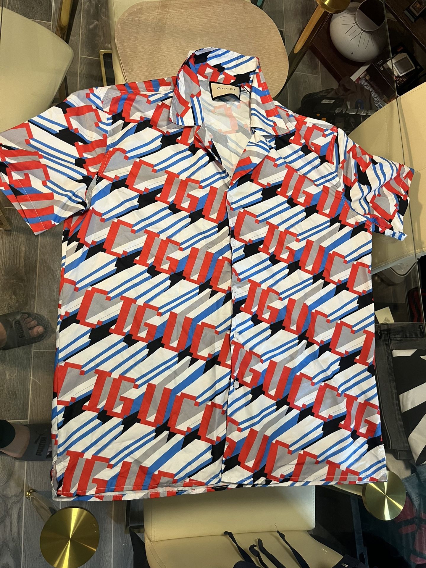 This is a Gucci Men's L Multicolor Geometric Cotton Button-Up Shirt Short Sleeve