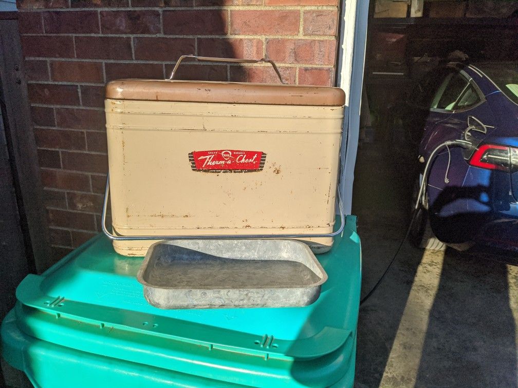 Therm A Chest ice chest from 1950s. Good condition with tray and can opener. Size 18x14x10