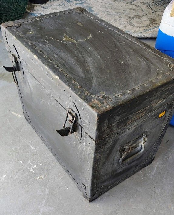 This is a Vintage Military-Style footlocker, a type of small trunk used for storing personal belongings, often by military personnel. This specific footlocker is olive drab green with metal hardware. Footlockers are typically placed at the foot of a soldier's bunk or bed and can be secured with a lock. Modern military-issue footlockers are often made from durable, injection-molded plastic with features like weather resistance and stackable designs.