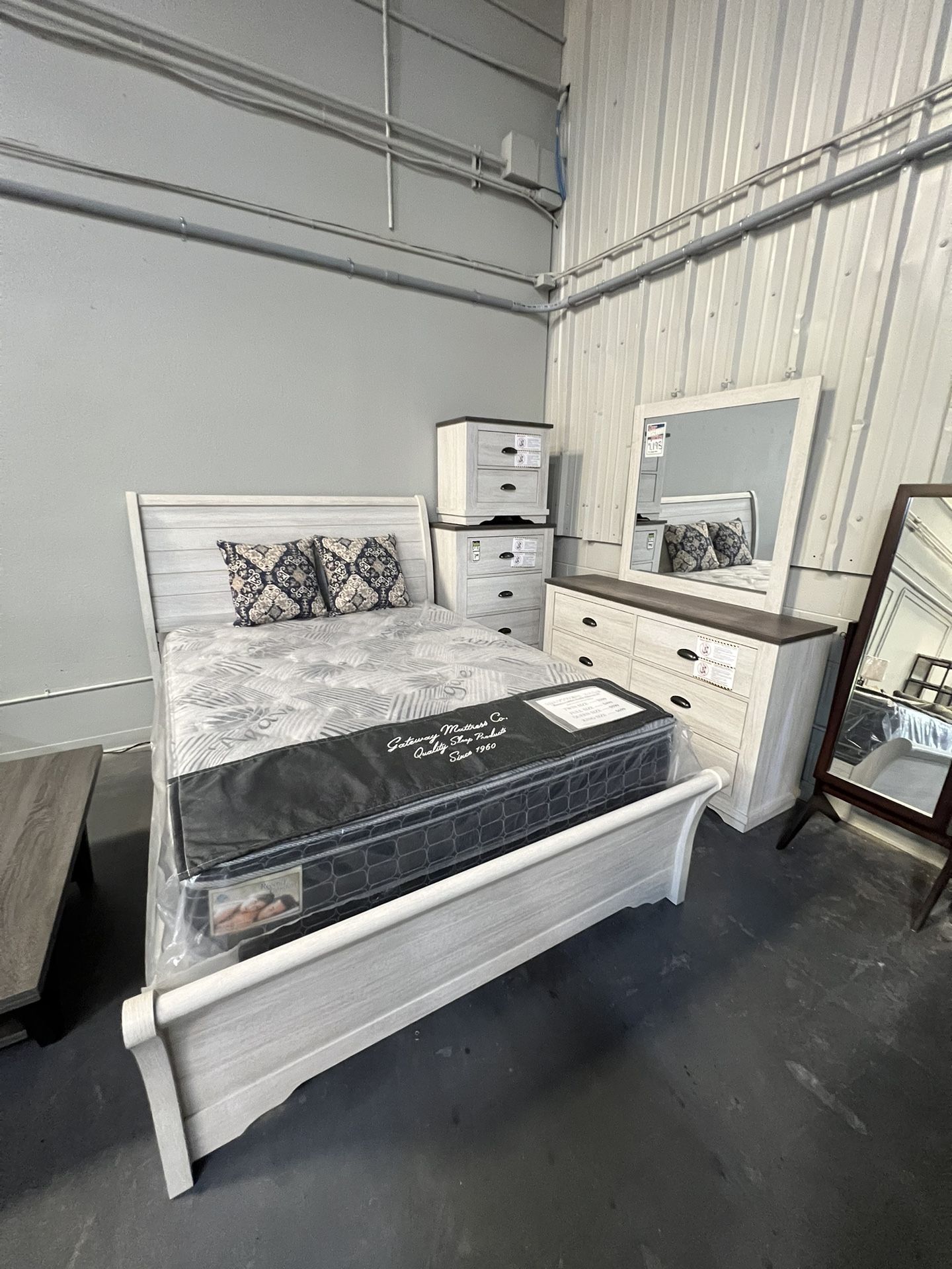 Includes: queen sized bed frame, 1- nightstand, dresser, and mirror chest is sold separately Come check it out at: Mirage Furniture Outlet 3777 Vaca Valley Pkwy Vacaville 95688 Open Thursday-Sunday 11am-4pm