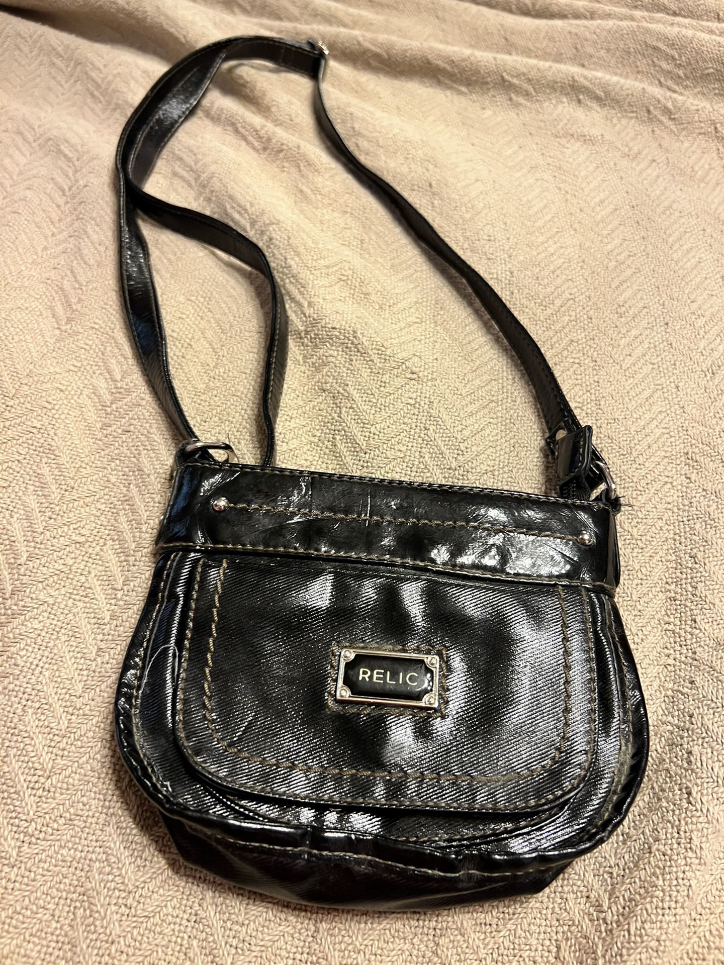 Relic purse. Black. Small. Has a pocket on the outside that snaps shut. Has a zippered pocket inside as well as 4 pockets for credit cards.