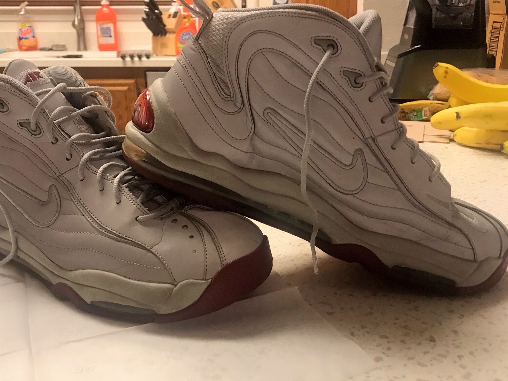 These are a great looking pair of Nike Air Total Max Uptempo 3M Attack Pack. They are in excellent condition, almost like new. These are well made durable shoes that are no longer available and sell over $450 when they were new. These come in a size 13. 366724 004 | metallic silver/metallic silver-team red are the colors. This pair will definitely stand out and catch your eye, as they feature a complete leather upper, which also sports a 3M reflective design. Nike decided to sit atop a grey midsole, and burgundy outsole, while the shoe also sports a full-length durable Air Max sole unit.
