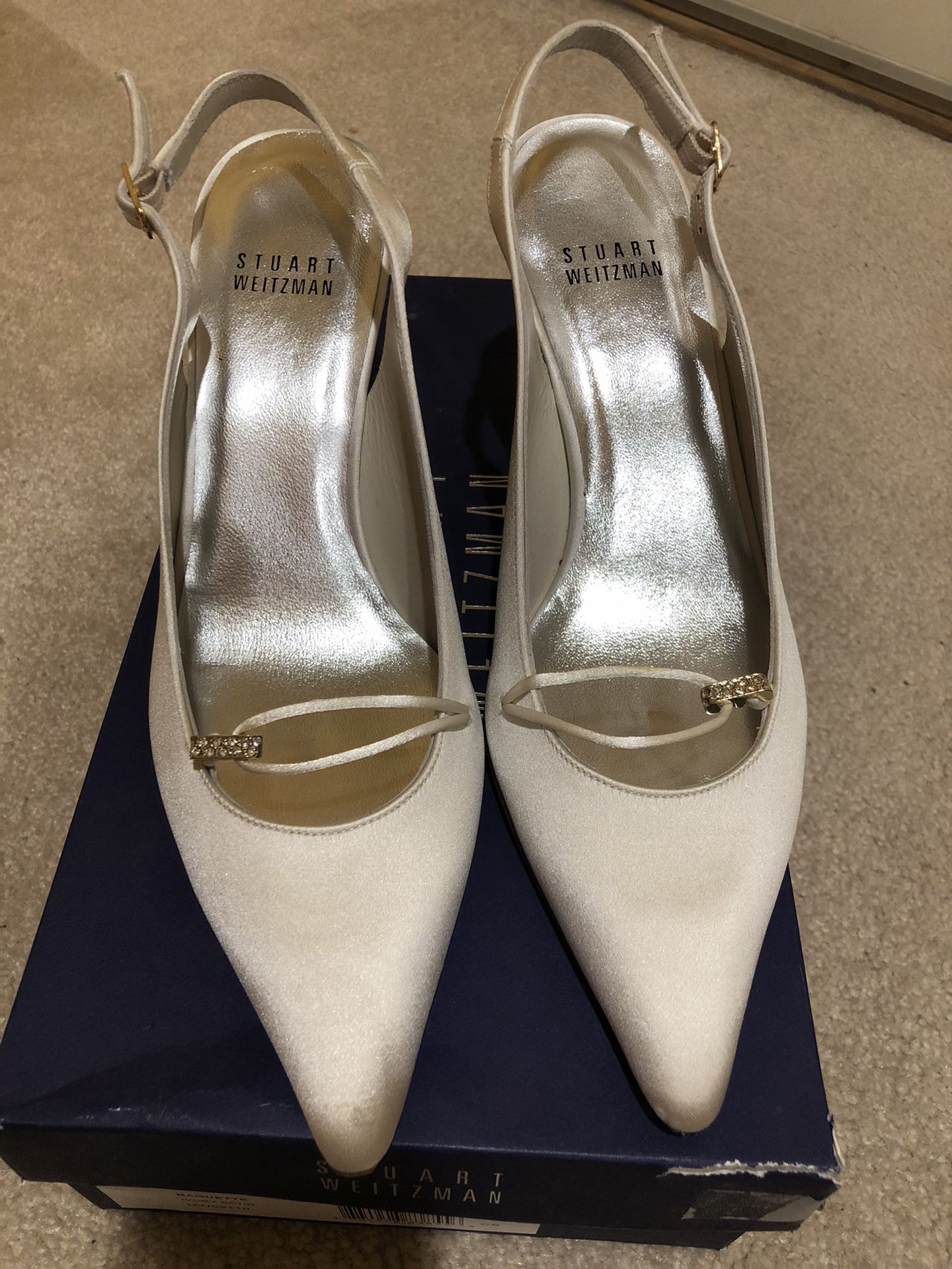 Brand new with box Size 6.5 Authentic Stuart weitzman white satin Retail at $395 Clearing out my closet