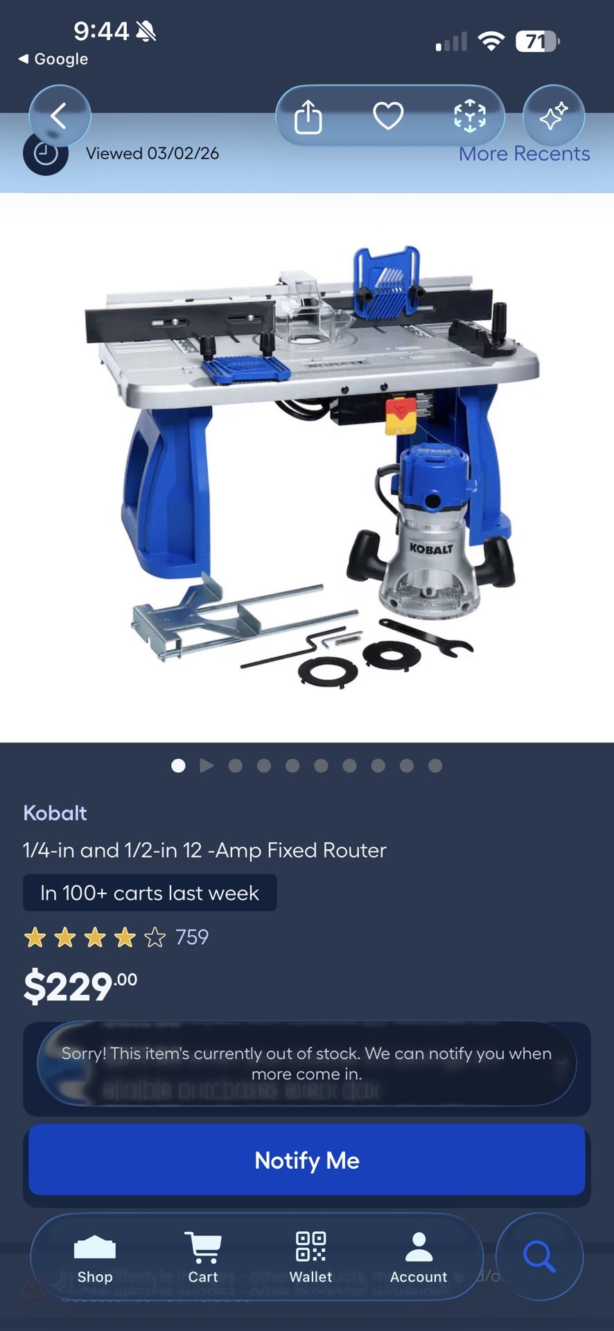This is a 12 amp Kobalt router and router table combo. The table is brand new, still in the box, never used, never unpacked or even put together… I did use the router a couple times by itself to try it out and of course it works great. These items are in excellent condition. I bought it a couple years back with the intention to start making cutting boards on the side, but never got around to it… this has been stored in my garage and the box looks a little beat up, but the items are perfect… Selling it to free up the space, and let someone else put it to good use. It sells today at Lowe’s for $229. I am asking $180. Thanks