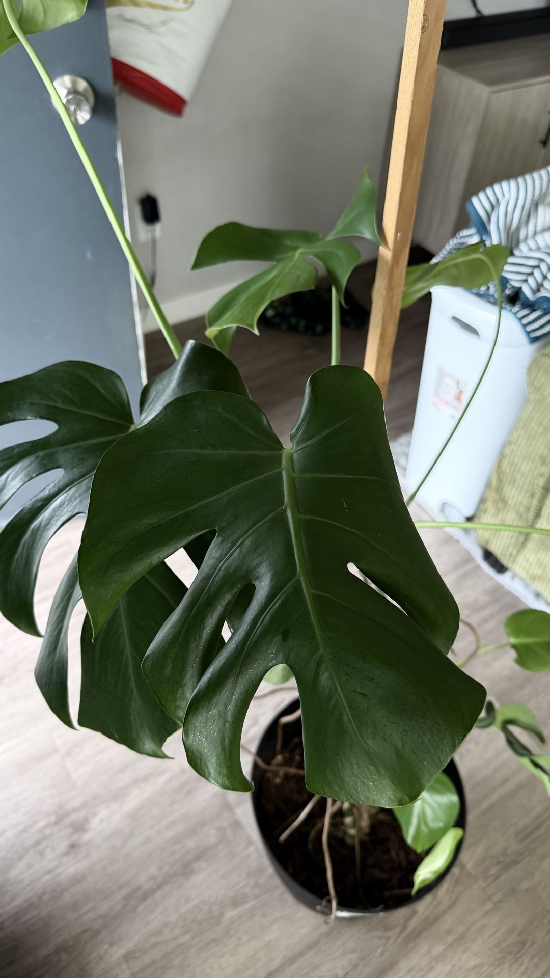 Monstera deliciosa plant in plastic pot that needs some love! Pot is about 15 inches tall, and the stick is over 5’10 in height! I can remove the stick if you don’t want it at pick up.