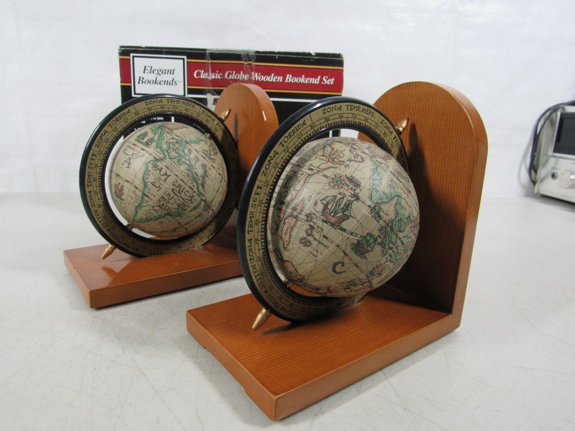 Elegant Classic Rotating Old World Globe Wooden Bookends NEW