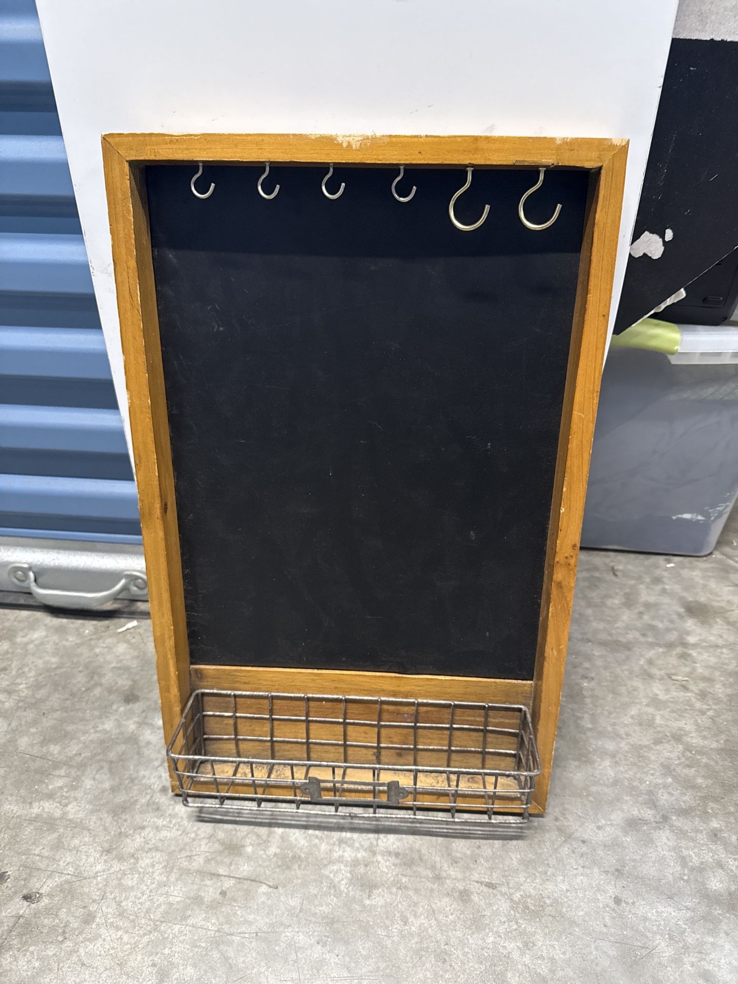 Stylish and functional wall-mounted organizer with a chalkboard surface, 6 metal hooks, and a bottom wire basket. Perfect for hanging keys, small tools, or kitchen accessories while jotting quick notes, reminders, or grocery lists. Details: • Real wood frame with black chalkboard center • 6 sturdy hooks for keys or utensils • Metal wire basket for mail, notepads, or small items • Built-in hanger on back for easy wall mounting • Condition: Used, light wear (see photos) Ideal for entryways, kitchens, garages, or offices — keeps your essentials neat and easy to find. Pickup in Oxnard only.