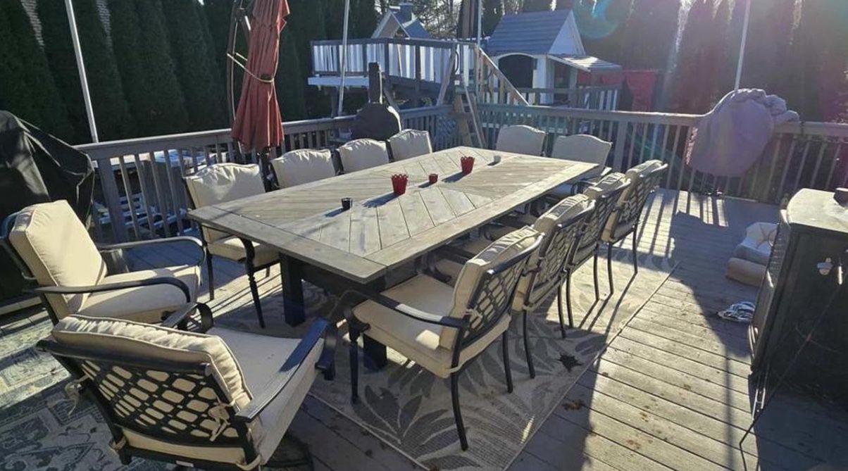 For Sale in Pompton Lakes, NJ 07442 Outdoor patio dining set featuring a large rectangular table with sturdy wood frame. Includes 12 cushioned chairs with beige cushions and metal frames, designed for comfort and durability. Ideal for outdoor dining and entertaining on decks or patios. 4 swivel base for added functionality. Set is in very good condition, suitable for immediate use.