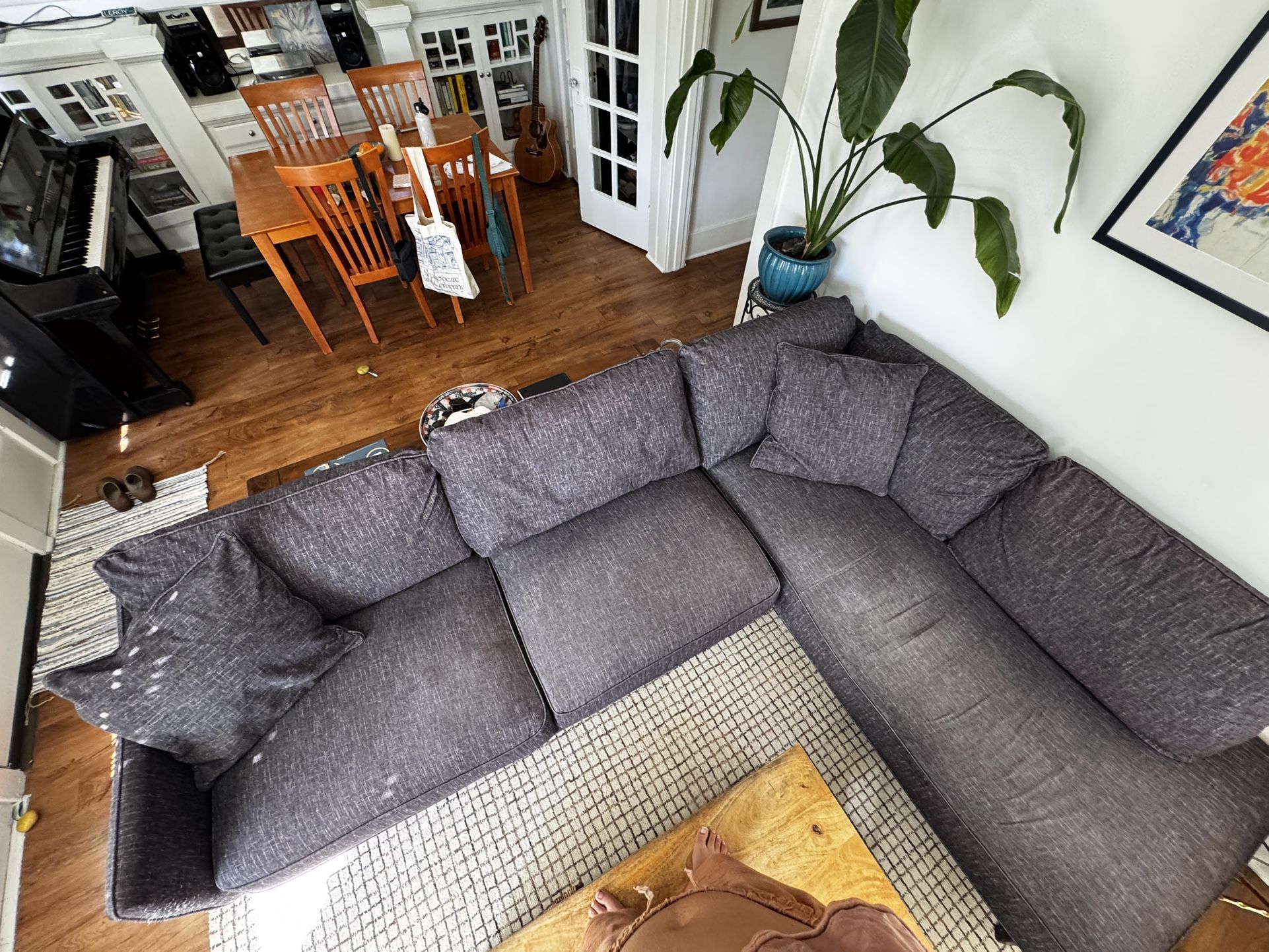 selling our gray or black/white couch made from polyester fabric. it is so comfortable. we have had it for 5 years but decided it’s too big for our current space. there are minor cat scratches on the corner but hardly noticeable due to the coloration of the couch. dimensions included in the photos. it is great for lounging, low to the ground but not low enough that it’s hard to get out. the seats are deep and the entire couch can fit 5 very comfortably.