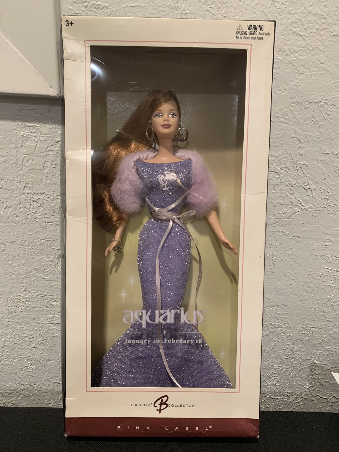 This Barbie has Long beautiful hair and is wearing a Sparkley Purple Gown with a Lavender Fur wrap. New in box