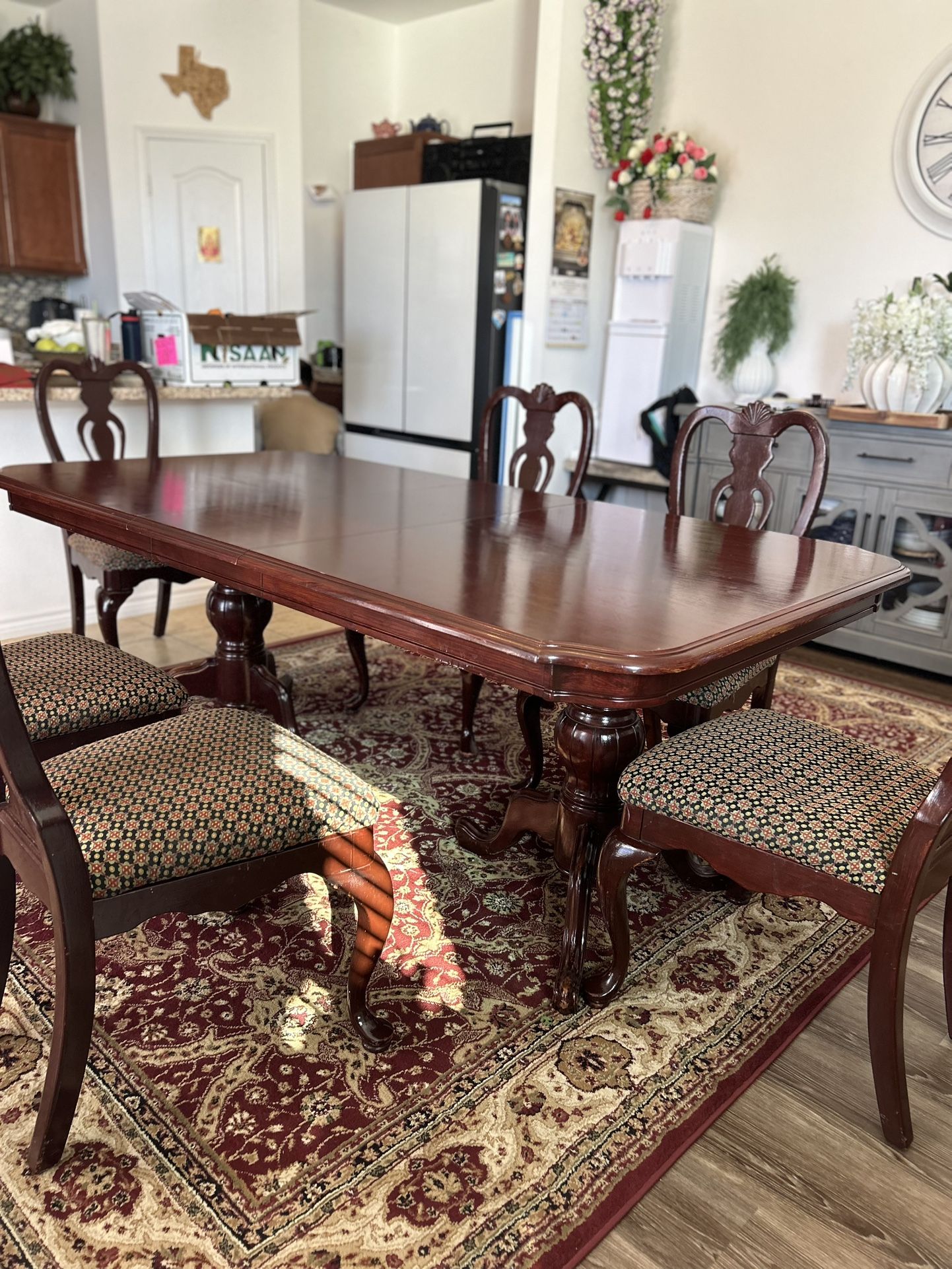 Solid wood dining table set in a rich brown finish. Includes one rectangular table and six matching chairs with cushioned, patterned seats. Features elegant carved legs and a smooth tabletop. Classic, traditional style. Sturdy and well cared for with light signs of normal use. Perfect for a dining room or kitchen area. Some noticeable paint blemishes.