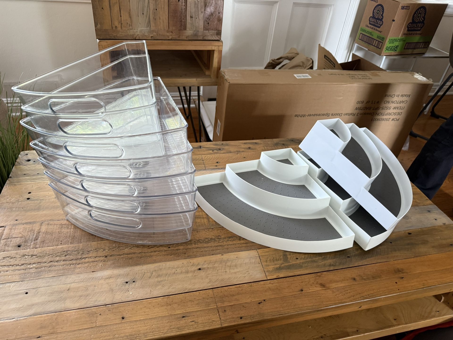 Get your kitchen or pantry organized! Selling a full set of 7 clear corner bins plus 3 white 3- tier corner lazy Susan shelf. All pieces are in great condition and perfect for maximizing cabinet or pantry space. $20 total Or $2 each Or best offer