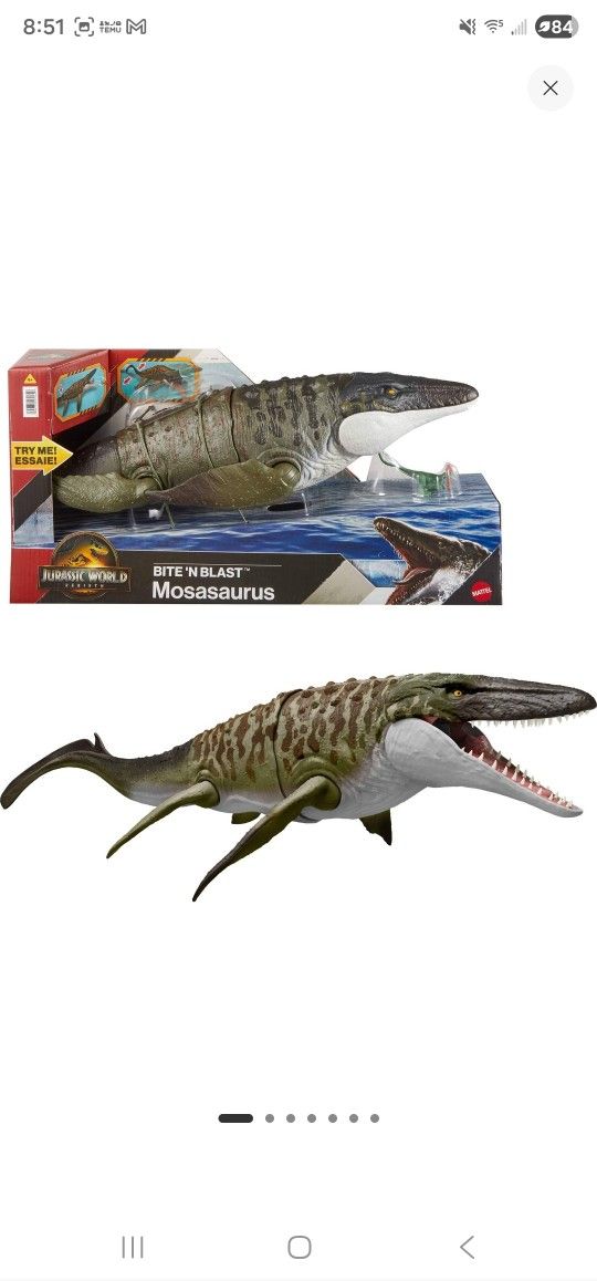 L 25.74" x W 8.66" x H 6.55" Jurassic World lives! Bring the excitement and thrills of Jurassic World Rebirth home with this distinctive Mosasaurus with exciting Bite 'N Blast moves, articulated fins and tail and 25.7-inch long size Total attack! Kids can easily hold the tail and press the button, or manually open the prey-seeking jaw. The jaw opens wide, ready to 'Bite' and swallow the Dilophosaurus mini figure! Spitting image! Hold the tail and press the button again and the Mosasaurus 'Blasts' the Dilophosaurus prey back out of its mouth