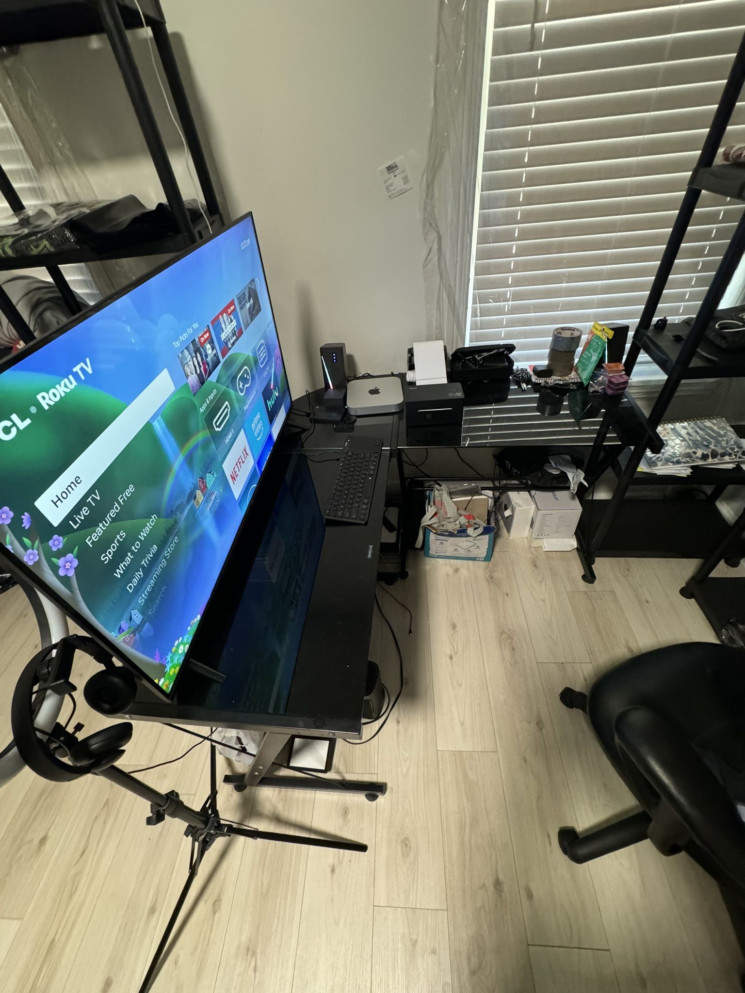 Made out of tempered glass, includes sliding keyboard compartment that tucks under desk. CASH ONLY