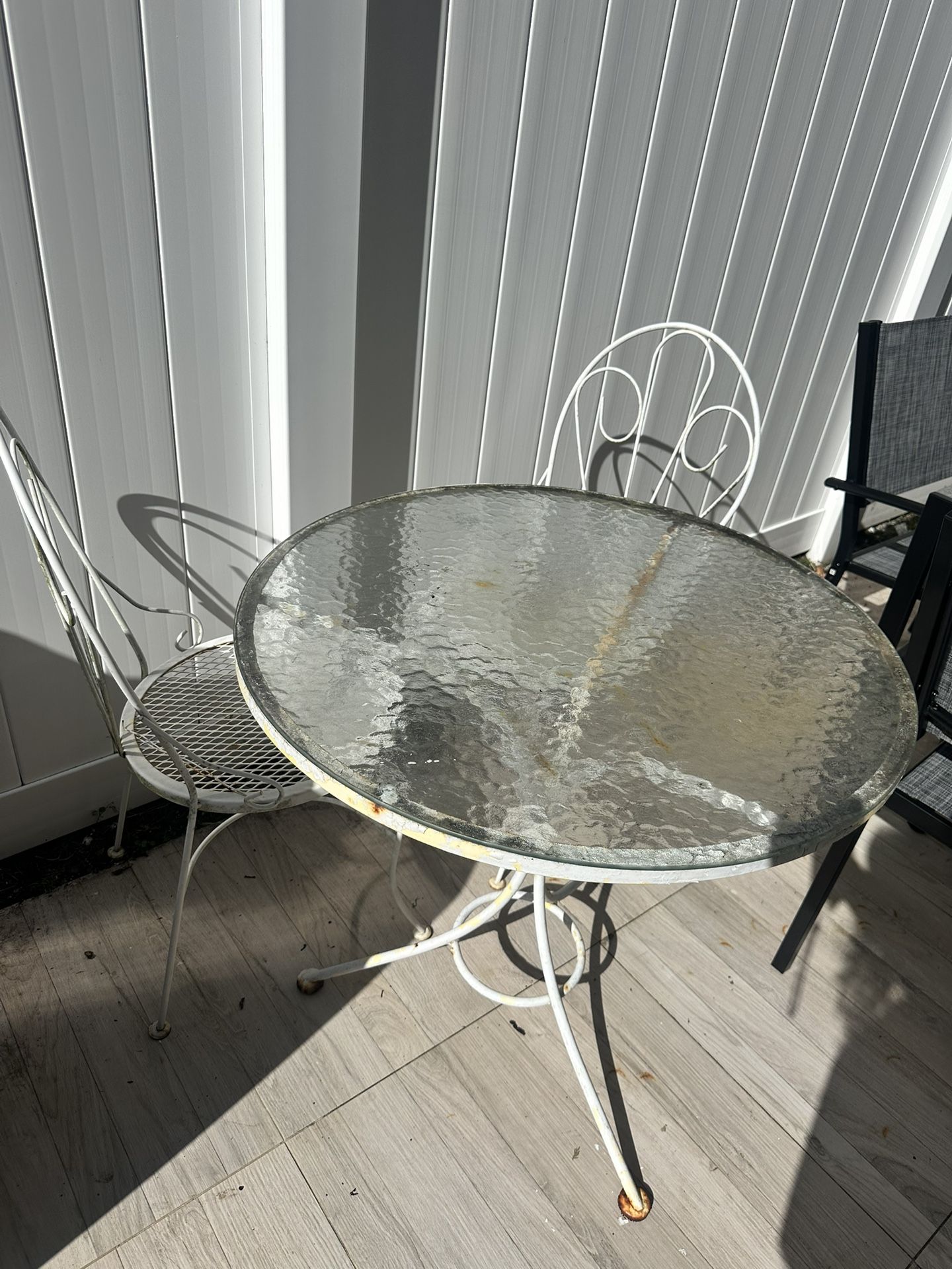 Outdoor patio bistro set — a small round glass-top table with two metal chairs. The frame is made of painted metal (likely iron or steel), and you can see some rust on the legs and edges. It’s the type of furniture commonly used on balconies, patios, or gardens for coffee or small meals. Need some paint and love, I have to move out and I don’t have more space. Juego de muebles para patio tipo bistró, con una mesa redonda de vidrio y dos sillas de metal. El marco es de metal pintado (probablemente hierro o acero) y se puede ver algo de óxido en las patas y los bordes. Es el tipo de mueble que se usa en balcones, patios o jardines para tomar café o comidas pequeñas. Solo necesita de pintura y cuidados, tengo que mudarme y ya no tengo espacio.