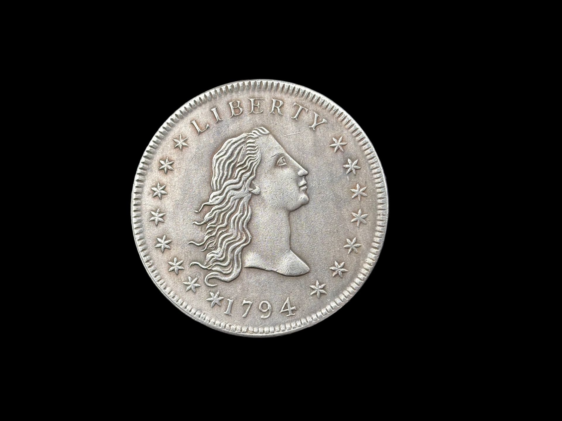 This coin, the USA 1 dollar 1794 'Flowing Hair Dollar', is extremely rare with a mintage of only 1,758. This coin has historical significance as one of the first silver dollars issued by the United States.