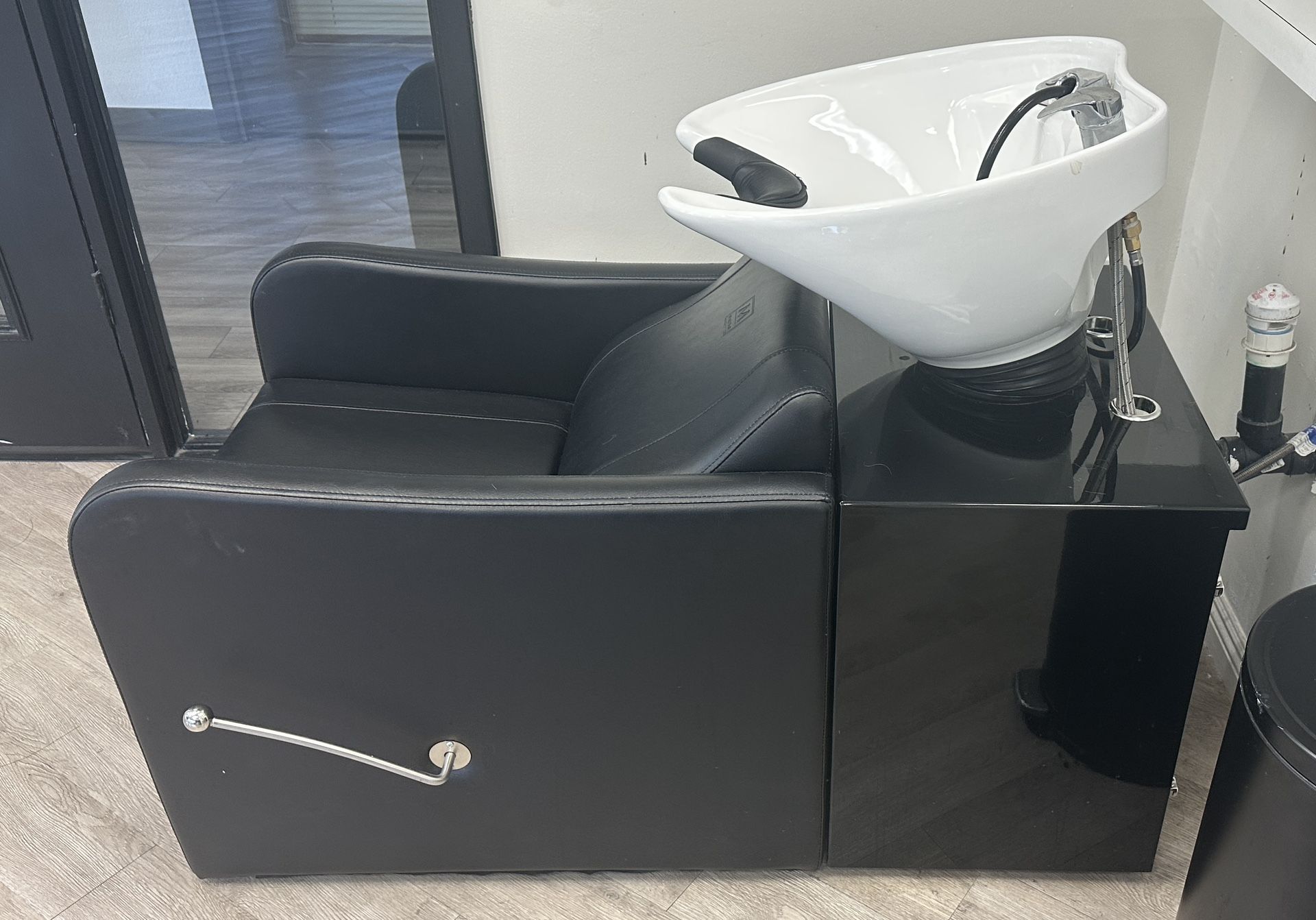 Perfect condition. The Hashima Shampoo System combines comfort and style with incredible accessibility and ease of use. Completely covered in smooth vinyl, the Hashima Shampoo System features high density foam cushioning with memory for maximum comfort, reclined seat with lumbar support, heavy duty 5/8" thick 7-ply plywood and steel reinforced frames, fully upholstered armrests, reinforced double stitching, black ceramic tilting bowl, premium gel neck rest, basket strainer, spray hose, UPC and cUPC certified fixtures, and flexible drain line. This shampoo system meets California TB117 Fire Retardant Standards. Paid more than $1,000 with delivery approx 10 months ago.