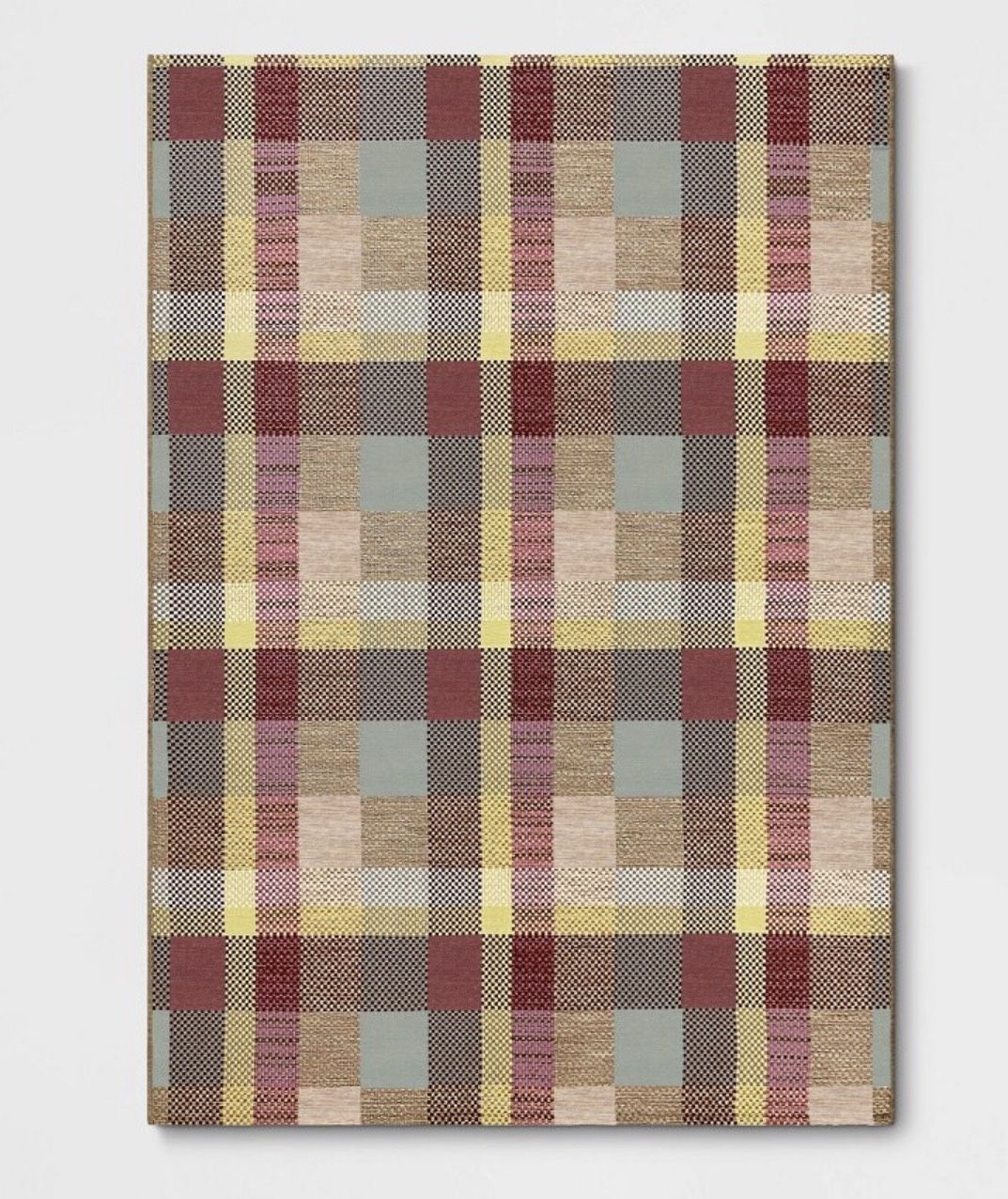 Brand new not used 5’x7’ Bold Plaid Outdoor Area Rug - Threshold™ Rectangular outdoor area rug • Bold woven plaid pattern • Polypropylene-polyester blend construction • Latex backing • Flat pile Features: Rectangle (shape) Dimensions (Overall): 10 Feet (L), 7 Feet (W) Fabric Name: Woven Style: Area Rugs Construction Technique: Machine Made Indoor/Outdoor: Outdoor Features: Reversible Backing Material: Latex Rug Material: 84% Polypropylene,16%polyester Pile type: Flat Pile Rug pile height: Flat Pile