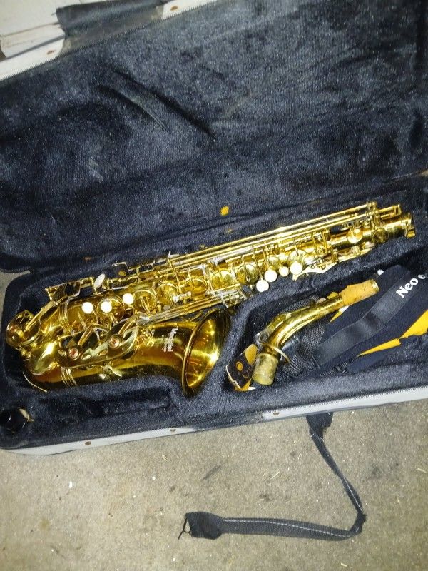 Gold saxophone by Mendini Cecilio. I'm posting for a friend so can't answer any questions but can give you his number to call if ur serious buyer