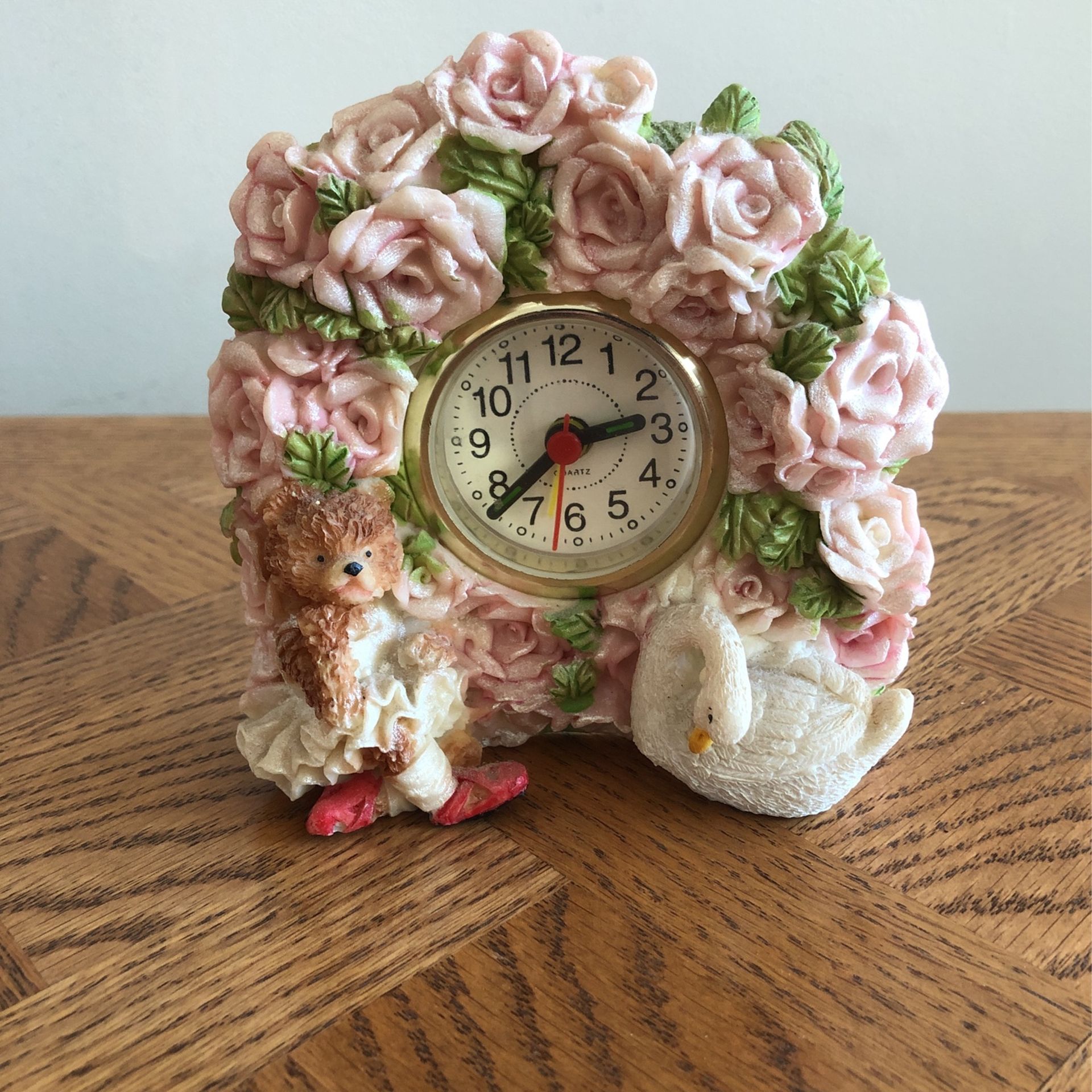 Roses Desk Clock Pink Decor Bear Swan Working