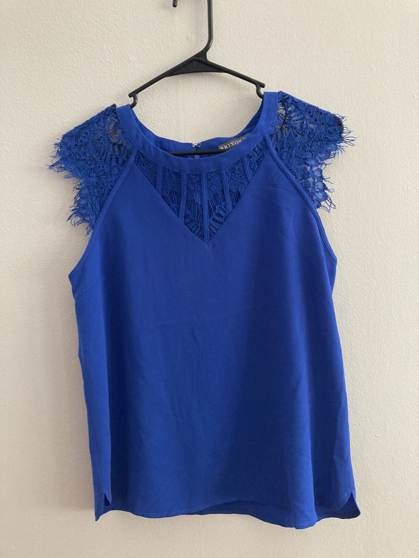 Cute blouse / work shirt Royal blue with nice detailed design around neck and shoulders Zips up in back Size small Located by Farragut park Thanks for looking