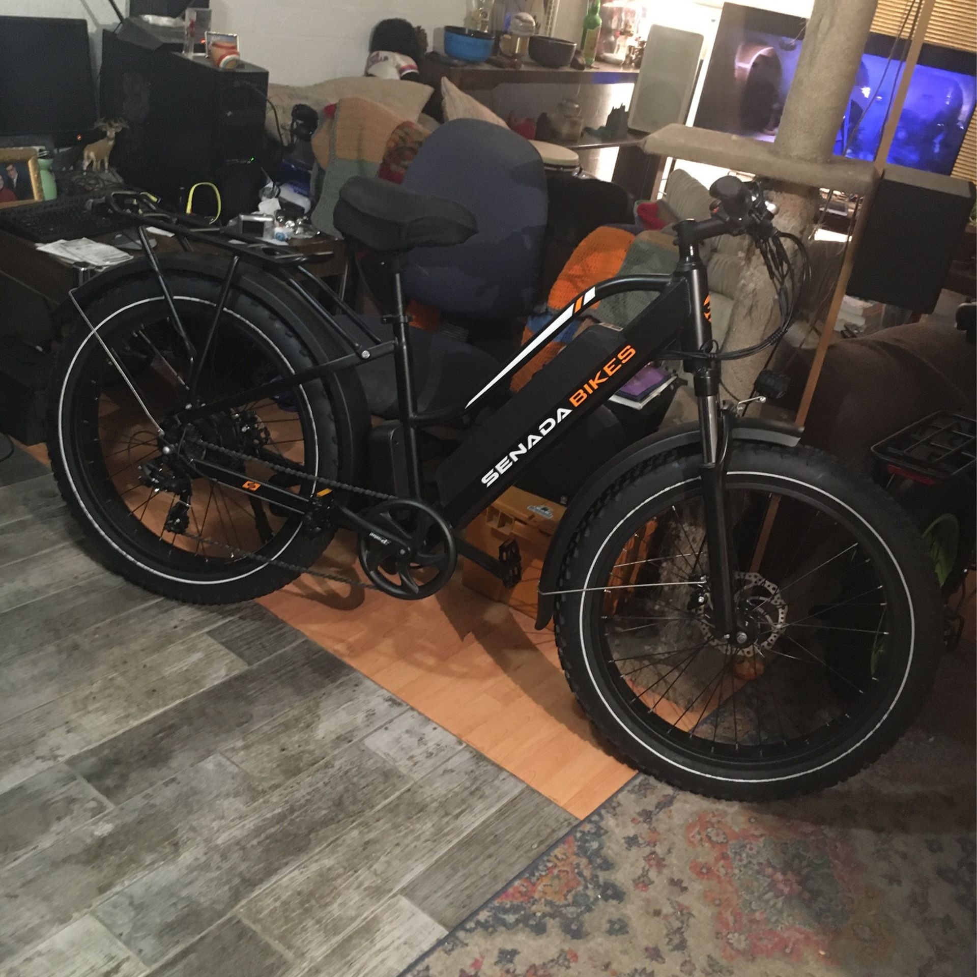Big sale on right now$540 off retail price New Super Awesome Monster Herald Pro!!! Senadas Top of their lineup E-Bike for sale, 2100 list!!! This Herald Pro Super E-Bike, is by far the Best deal I have on every level, with crazy 95 Newton meters of wheel spinning torque and 35 mph. This is a true Hybrid, the Super bike of your dreams and has a 5 inches lower top tube height than a regular top tube and will accommodate any height people and still looks cool!!! This is the Only place in the world where you can get a 1000 watt motor with the crazy 95 Newton meters of torque!!! From setting 1 to 5, as low as 12 mph on #1 and 30 plus mph on #5, others bikes 16 to 25 mph for same price!!! Stupid 60/80 mile range and depends on whether U peddle and or use peddle assist or not, 48 volt lithium ion battery with 21 amp hrs run time, Super torque 1000 Watt, monster motor w/95 Newton meters of super torque in this brushless motor, others are 500, 750 watt, and half the torque, poor them!!! Black with some highlights, is what I carry but can get, all white with red highlights and black rim’s, all very cool indeed!!! Front fork with lockout, Huge 180mm disc brakes, 7 speed Shimano shifter and durrailure. Big soft seat, 26 by 4 inch knobbies, integrated led front light and rear taillight, break light and left right turn signals and rear, long fenders, Big and much better stopping with Huge 180mm Disc that stop on a dime etc etc . So much on it can't list it all!!! This is selling for 1,600.00, so Message me and I will get back to you asap and thanks for looking! Oh yeah come by for a demo ride for free, as many as you want!!! 2 year warranty from Senada ebikes on everything but battery that is one year and I Handle all for you and the industry Leading 5 Years of free adjusting, tuning if needed anytime from me. Although these are tanks and never seen one with issues yet but I am here if you need anything. No one else offers this kind of protection at any price, period!!! Oh yeah, can make any old bike {or new} into a awesome custom E-Bike with any amount of power and distance you want, it all depends on how much money you want to spend!!! Have fun be free and own the streets!!! Maybe slow to respond as do this on a computer but check off and on day and night so thx for your patience! Just message me to come see and ride this monster!!! Thx soooooo much for looking and hope to see you soon, Dana. Do yourself a favor and do research so you don’t offer half of the full value and look Stupid!!!!! No Lowball offers, Stupid Low offers will be deleted!!!