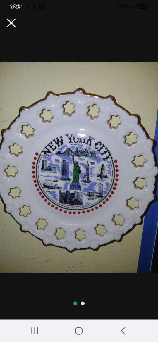 Plate including Twin Towers, Statue of Liberty, Empire State Building, NYC decorative Collector in excellent condition no stain, chips nor scratches vintage for 1990's measurements 8"Round with outs cut at the border & 4 points of gold highlights vin
