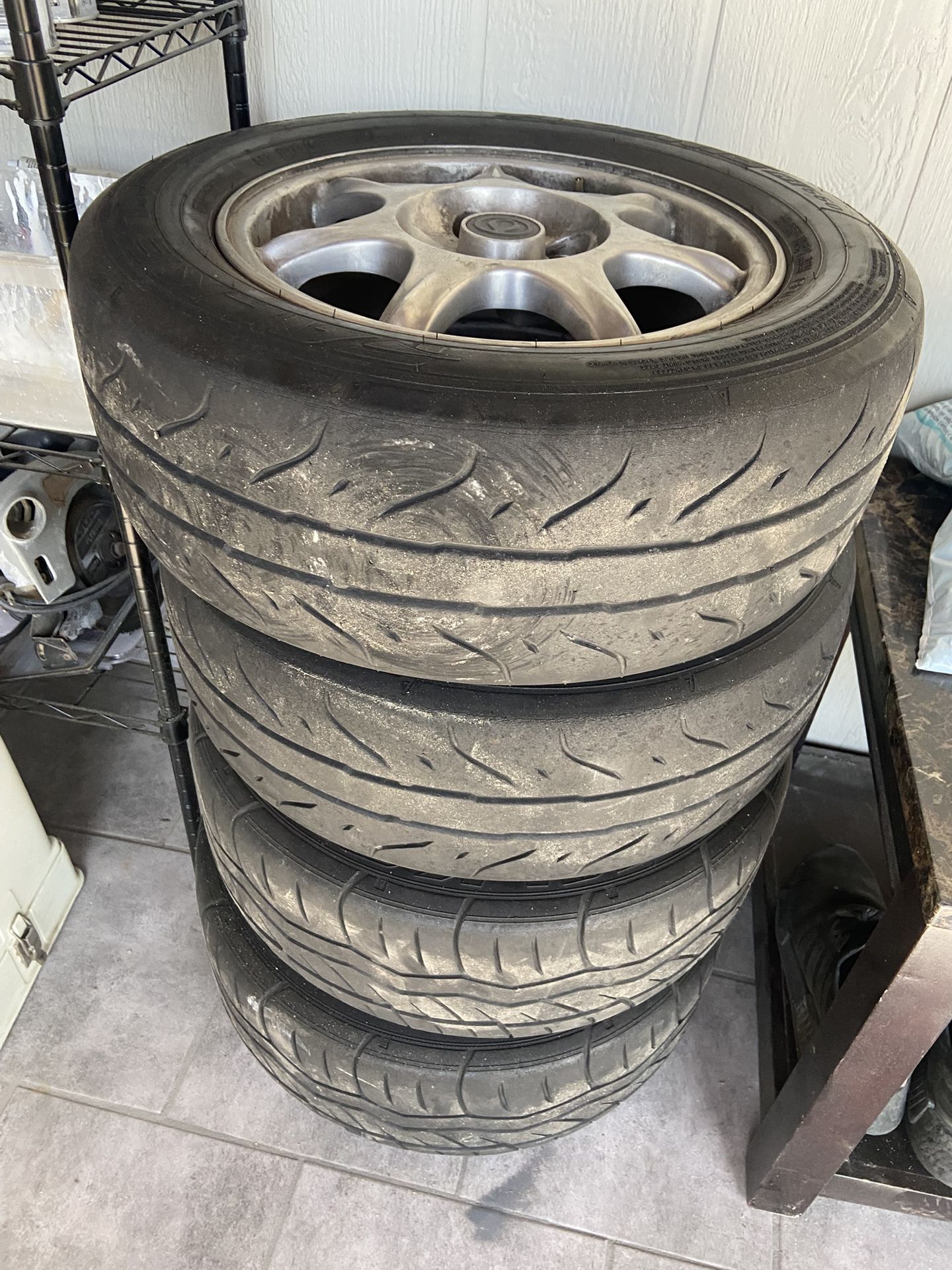 These are off a 1994 mazda miata 195/60r14 falken tires on a 14x6 +45 4x100 rim -2 are falken azenis rt615K+ tires and are 3 years old -2 are falken azenis rt 660 and are close to 6 years old so I recommend replacing those