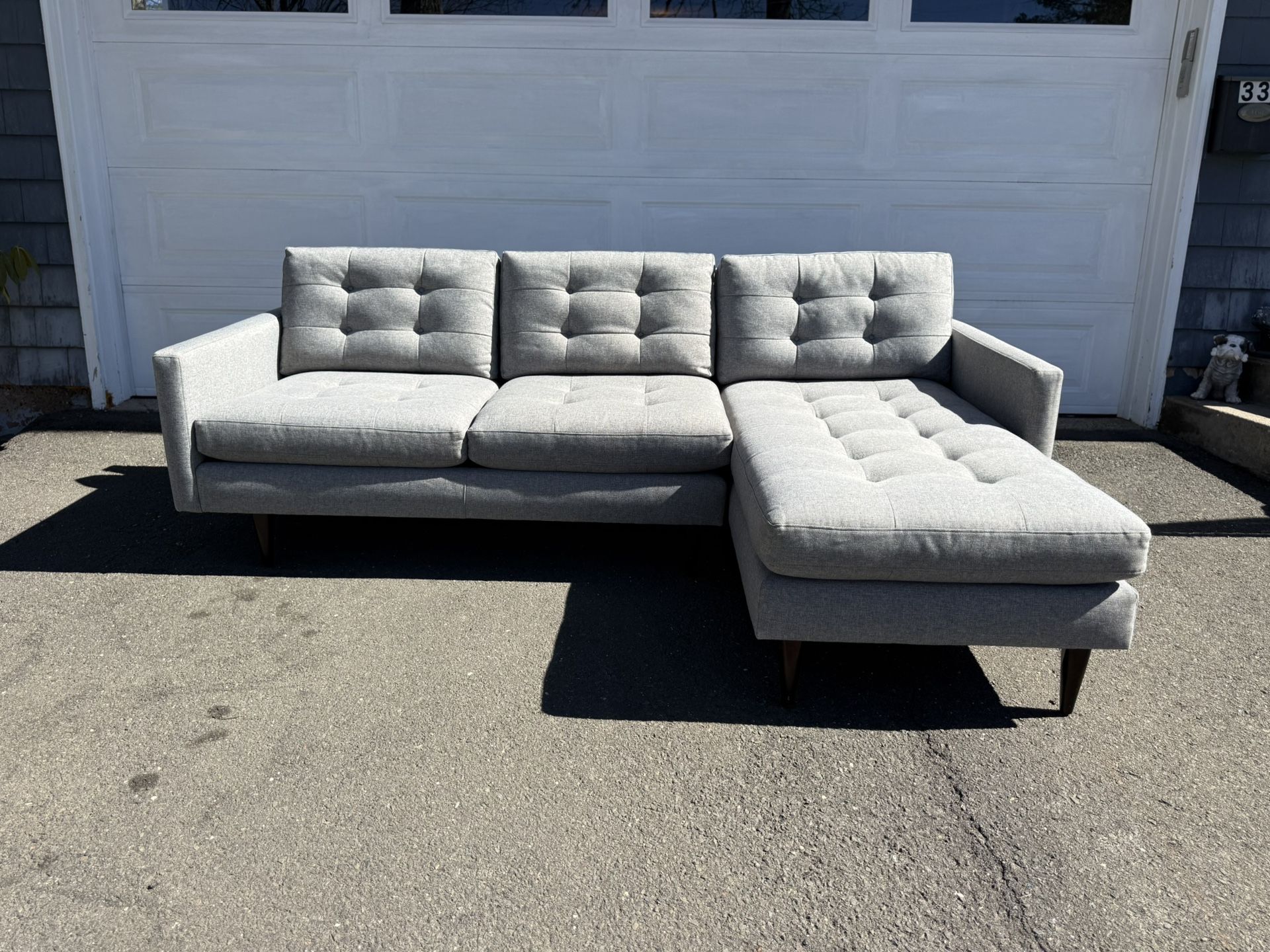 What I’ve got here is a used like new Crate and Barrel Petrie 2-Piece Midcentury Sectional Sofa with Chaise Lounge in excellent condition. Overall Dimensions Width: 93" Depth: 63" Height: 32" Petrie is a distinct living room sectional sofa that sits at the intersection of mid-century and today, with clean lines and tailored cushions expertly button-tufted by hand. Now a Crate and Barrel classic, its pure 1960s aesthetic is scaled deep so you can sit firm and upright, but also slouch back in comfort. Well-suited to make a great impression, the menswear-inspired fabric tailors Petrie's sleek, boxy cushions and slim track arms with heathered color and soft texture. Here, we've paired the left arm loveseat and right arm chaise; you might also choose to add companion pieces from the Petrie Sectional Collection. The Petrie 2-Piece Right Arm Chaise Midcentury Sectional Sofa is a Crate and Barrel exclusive. Frames are benchmade with hardwood that's kiln-dried to prevent warping Sinuous wire spring suspension systems Seat cushions have soy based polyfoam wrapped in fiber encased in downproof ticking Back cushions have a blend of virgin and recycled fiber encased in downproof ticking Hardwood legs finished with a dark ebony stain Topstitched and button-tufted detail Left Arm Loveseat, Right Arm Chaise Made in USA of Imported Materials This couch was purchased for $3400 and was used in an home office which rarely got any wear Free local curbside delivery