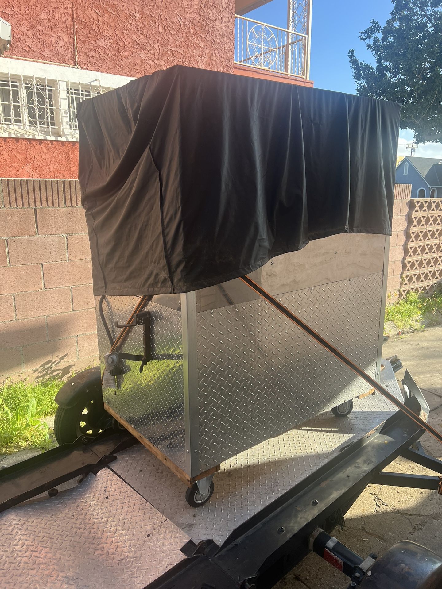 Great compact food cart for selling hot foods like (hot dogs, tacos de canasta, breakfast burritos, pretzels, churros, you name it). It has a propane steam table built in to hot hold for many hours. 2 drawers and a utility storage area. The open space to the left fits 1/6th steam table pans. It’s not intended for cooking but it does get hot enough to boil water for dogs. I’ve had great success with this cart starting out and selling it to buy a trailer now.